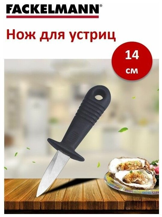 Нож для устриц FACKELMANN поможет без труда открыть ракушку устрицы. Для этого Вам необходимо сначала зажать раковину в левой ладони. Затем нужно вставить нож между створок и аккуратно повернуть его до характерного щелчка. После того, как вы подрежете по кругу верхнюю мышцу, соединяющую створки, раковина без проблем откроется. Перед тем, как насладиться этим изысканным деликатесом, можете капнуть немного лимонного сока на мякоть он придаст моллюску поистине волшебный вкус. Нож изготовлен из нержавеющей стали, эргономичная ручка выполнена из пластика. Альтернативное использование - для безопасной нарезки пармезана и любых других твёрдых сыров. Длина лезвия 6 см. Качественный и долговечный нож понравится гурманам и любителям свежих устриц. Размер изделия: длина - 14 см, размер клинка - 6 см, размер рукояти - 8,5 см, ширина гарды - 5 см, глубина гарды - 3 см, диаметр отверстия на ручке - 1 см.