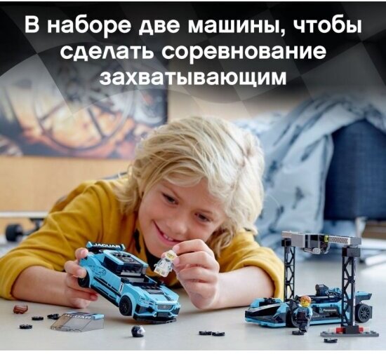 Конструктор LEGO Speed Champions 76898 Formula E Panasonic Jaguar Racing GEN2 car & Jaguar I-PACE eTROPHY приведет в полный восторг всех любителей гонок! Здесь ребенок обнаружит целых два автомобиля, между которыми сможет устроить соревнование в скорости. Но для начала набор LEGO Speed Champions предлагает собрать машины из имеющихся тут деталей. Благодаря приложенной подробной инструкции сделать это будет очень просто. А дальше можно поставить модели на полку или же развлекаться с ними, организовывая гонки. Это прекрасный подарок ребенку на 8 лет, если он увлекается гоночными автомобилями.Сразу две красивые модели.Есть фигурки пилотов.Для игры потребуются батарейки.В комплекте:Два автомобиля.Две минифигурки пилотов.Линия старта.