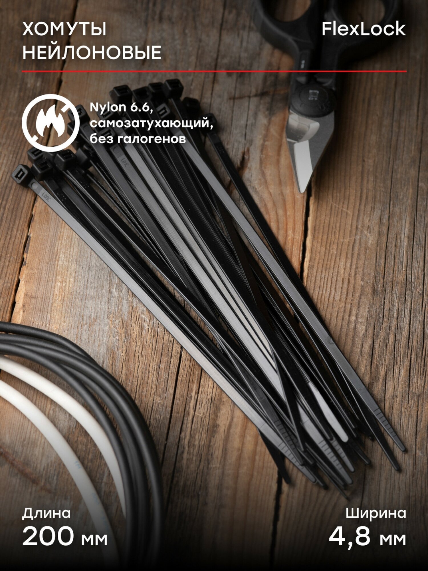 Хомуты серии FlexLock предназначены для увязки кабелей и проводов в пучок и монтажа кабельных линий и проводников. Изготовлены из полиамида 6.6, который обладает хорошей устойчивостью к маслам, смазкам, масляным производным, хлоридным растворителям, устойчивостью к слабым кислотам и УФ-лучам. Кабельные стяжки серии FlexLock имеют самофиксирующийся ремешок с блокирующим механизмом. При производстве кабельных стяжек черного цвета добавляется угольный порошок, который является одним из наиболее эффективных стабилизаторов. Он улучшает физические свойства продукции в стойкости к погодным условиям и УФ-излучению (прямые солнечные лучи). Наборы хомутов в банках представляют собой кабельные стяжки наиболее распространенных габаритов и разных цветов собранных в одной пластиковой упаковке. Благодаря прозрачной пластиковой упаковке такие наборы легко транспортировать и легко идентифицировать какой цвет и габарит хомута находится в упаковке. Разные цвета очень удобны в применении в быту и для маркировки. ПРЕИМУЩЕСТВА. Класс воспламеняемости сырья: UL 94-V2. Материал: Nylon 6.6, самозатухающий, без галогенов. Высокий диапазон рабочих температур. Широкий диапазон габаритов – шириной от 2,5 до 12,4 мм и длиной от 8 см до 1 м. ПРИМЕНЕНИЕ. Хомуты предназначены для увязки кабелей и проводов в жгут и монтажа кабельных линий и проводников, как внутри помещений, так и снаружи.