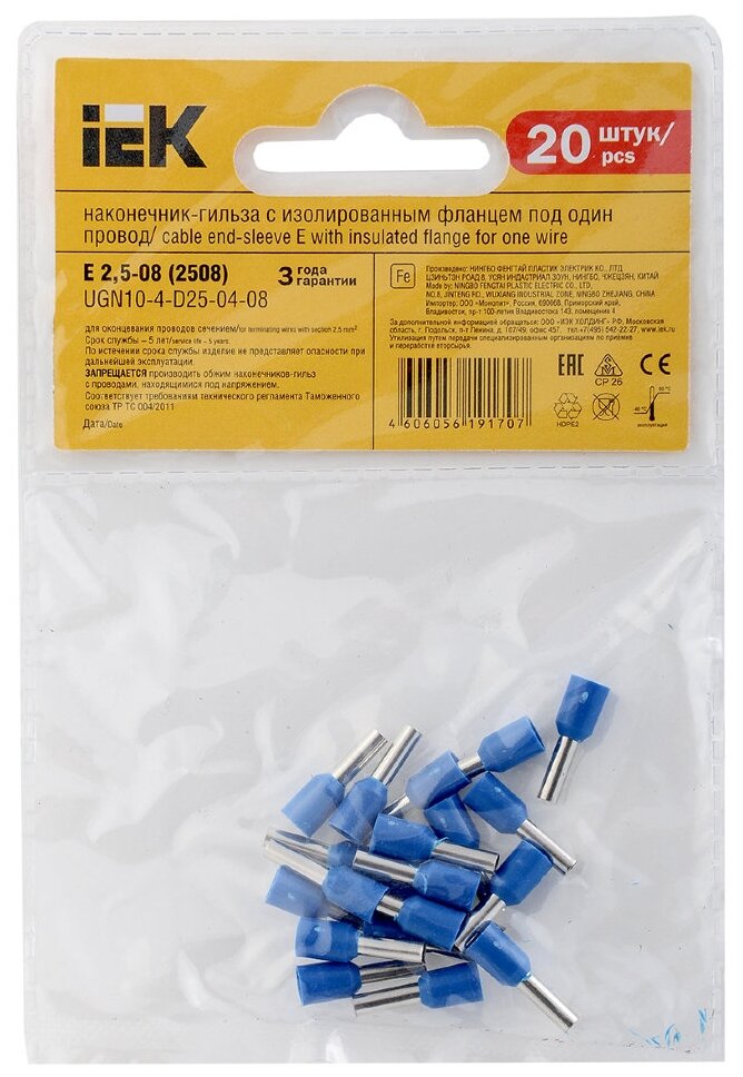 UGN10-4-D25-04-08 Наконечник-гильза Е2508 25мм2 (синий 20шт) ИЭК Упаковка (120 шт.) IEK