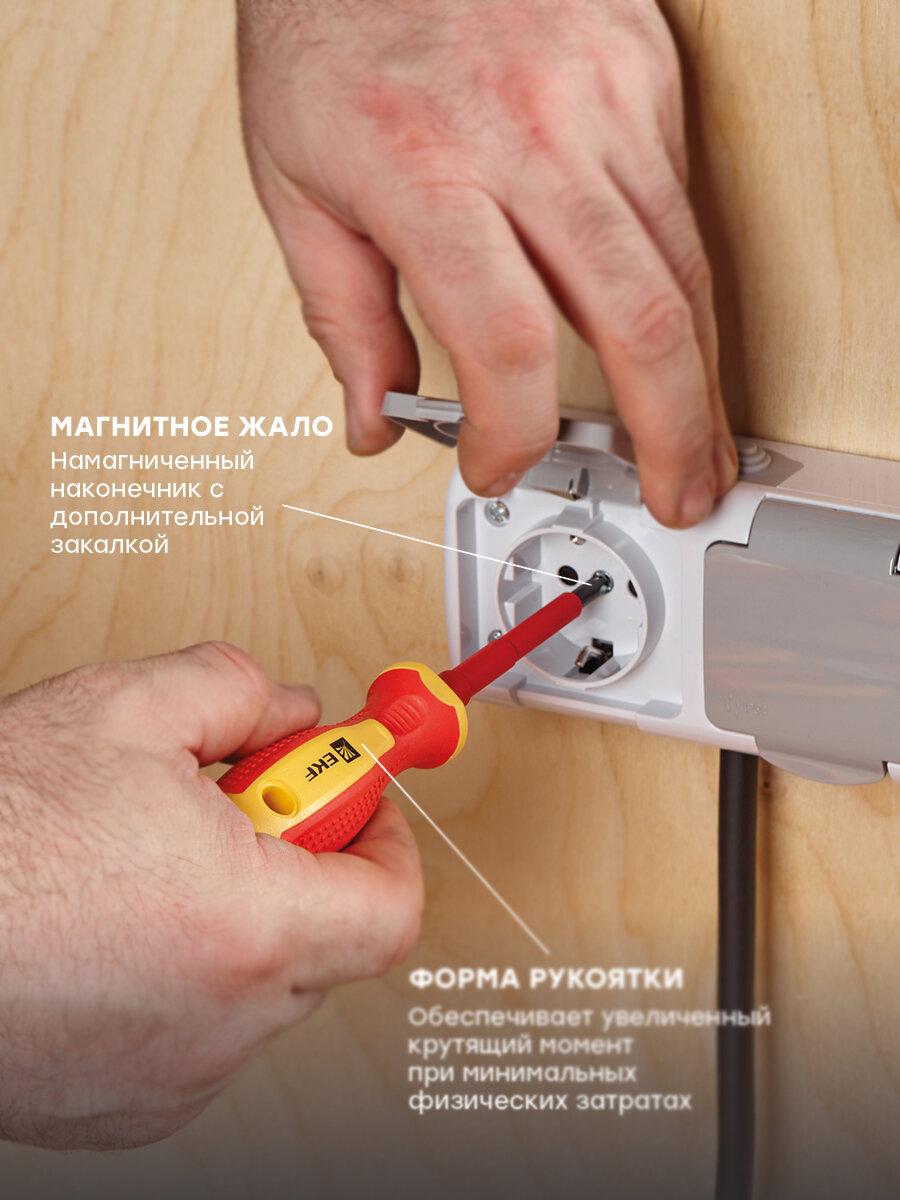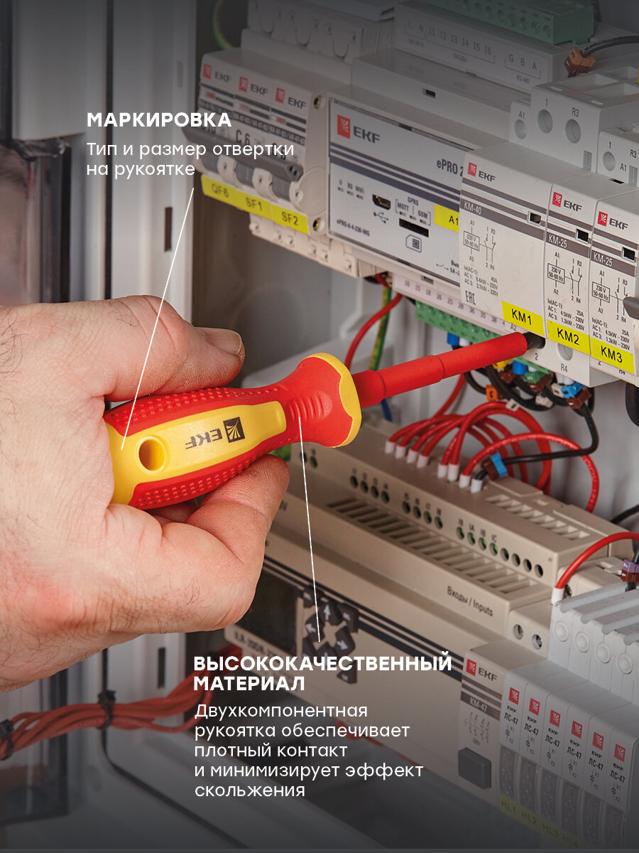 ОПИСАНИЕ. Диэлектрические отвертки – специальный профессиональный инструмент с изоляционным покрытием для безопасной работы с приборами и электросетями, находящимися под высоким напряжением (до 1000В). Отвертки серии Master и отвертки серии Expert изготовлены в строгом соответствии с требованиями EN 60900 / IEC 60900:2004 и каждая отвертка проходит индивидуальное тестирование воздействием напряжения в 10 000 В. ПРЕИМУЩЕСТВА. • Рабочая часть отверток выполнена из Cr-V – хромованадиевой стали, что делает ее устойчивой к механическим повреждениям, температурным воздействиям и образованию коррозии. • Намагниченный наконечник с дополнительной закалкой Master HRC 50-55 Expert HRC 52-58. • Высококачественный материал двухкомпонентной рукоятки обеспечивает плотный контакт и минимизирует эффект скольжения. • Специальная форма рукояток обеспечивает увеличенный крутящий момент при минимальных физических затратах. • Маркировка типа и размера отвертки на рукоятке. ПРИМЕНЕНИЕ. Диэлектрическая отвертка предназначена для работы с крепежом, который используется в электротехнических устройствах, находящихся под напряжением. Благодаря специальному изоляционному покрытию, исключается риск поражения пользователя током, даже когда напряжение достигает 1000 В.