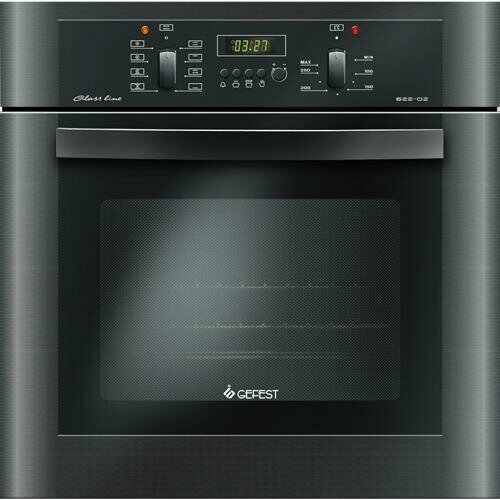 Фасад электрического духового шкафа Gefest 622-02 А выполнен в черном цвете. Принадлежащая к классу электропотребления А бытовая техника характеризуется номинальной потребляемой мощностью 3.2-3.3 кВт. В конструкции духового шкафа предусмотрены верхний и нижний ТЭНы, турбо- и электрогриль. Gefest 622-02 А с полезным объемом 52 л подсвечивается изнутри во время приготовления пищи. В представленной модели реализована двойная подсветка. Управление температурой и способом нагрева производится путем вращения механических регуляторов. Значение времени задается посредством сенсорного таймера. Встроенный вентилятор позволяет применять обдув во время приготовления пищи, что способствует выравниванию температур по всему объему духовки. Защитный жировой фильтр не допускает попадания брызг на вентилятор. Вертел с электроприводом дает возможность готовить крупные мясные и другие продукты, обеспечивая равномерность запекания благодаря вращению.