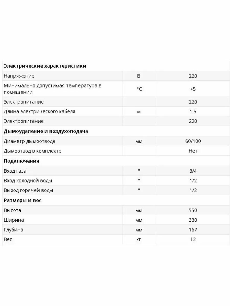 | Прочие особенности и свойства | ОСНОВНЫЕ ХАРАКТЕРИСТИКИ , Продукт Водонагреватель, Тип Проточный, Способ нагрева Газовый, Способ монтажа Настенный, Способ установки Вертикальный, Тип газа Природный газ, КОНСТРУКЦИЯ , Камера сгорания Закрытая, Отвод продуктов сгорания Принудительное дымоудаление, Управление Электронное, Модуляция температуры Термостатическая, Способ розжига Электророзжиг, Материал корпуса Сталь, Материал теплообменника Медь, Вентилятор Да, ТЕХНИЧЕСКИЕ ХАРАКТЕРИСТИКИ , Производительность ГВС (?Т=25°С) л/мин 11, Минимальное давление воды бар 0,1, Максимальное давление воды бар 8,5, ДАВЛЕНИЕ И РАСХОД ГАЗА , Входное давление газа (G20/G30/G31) мбар 13-20/28-30/37, Минимальное давление газа на горелке (G20) мбар 1,7, Максимальное давление газа на горелке (G20) мбар 7, Количество форсунок 10, Максимальный расход газа в режиме ГВС (G20) м3/ч 2,2, Максимальный расход газа в режиме ГВС (G31) кг/ч 0,79, ЭЛЕКТРИЧЕСКИЕ ХАРАКТЕРИСТИКИ , Напряжение В 220/50, Минимально допустимая температура в помещении °C +5, Электрический кабель в комплекте Да, Длина электрического кабеля м 1,5, Электропитание розжига В 220, ДЫМОУДАЛЕНИЕ , Диаметр дымоотвода мм 60/100, Дымоотвод в комплекте Нет, ПОДКЛЮЧЕНИЯ , Вход газа '' 3/4, Вход холодной воды '' 1/2, Выход горячей воды '' 1/2, РАЗМЕРЫ И ВЕС , Высота мм 550, Ширина мм 330, Глубина мм 167, Вес кг 12, ДОПОЛНИТЕЛЬНАЯ ИНФОРМАЦИЯ , Гарантия г 2, Страна Китай |