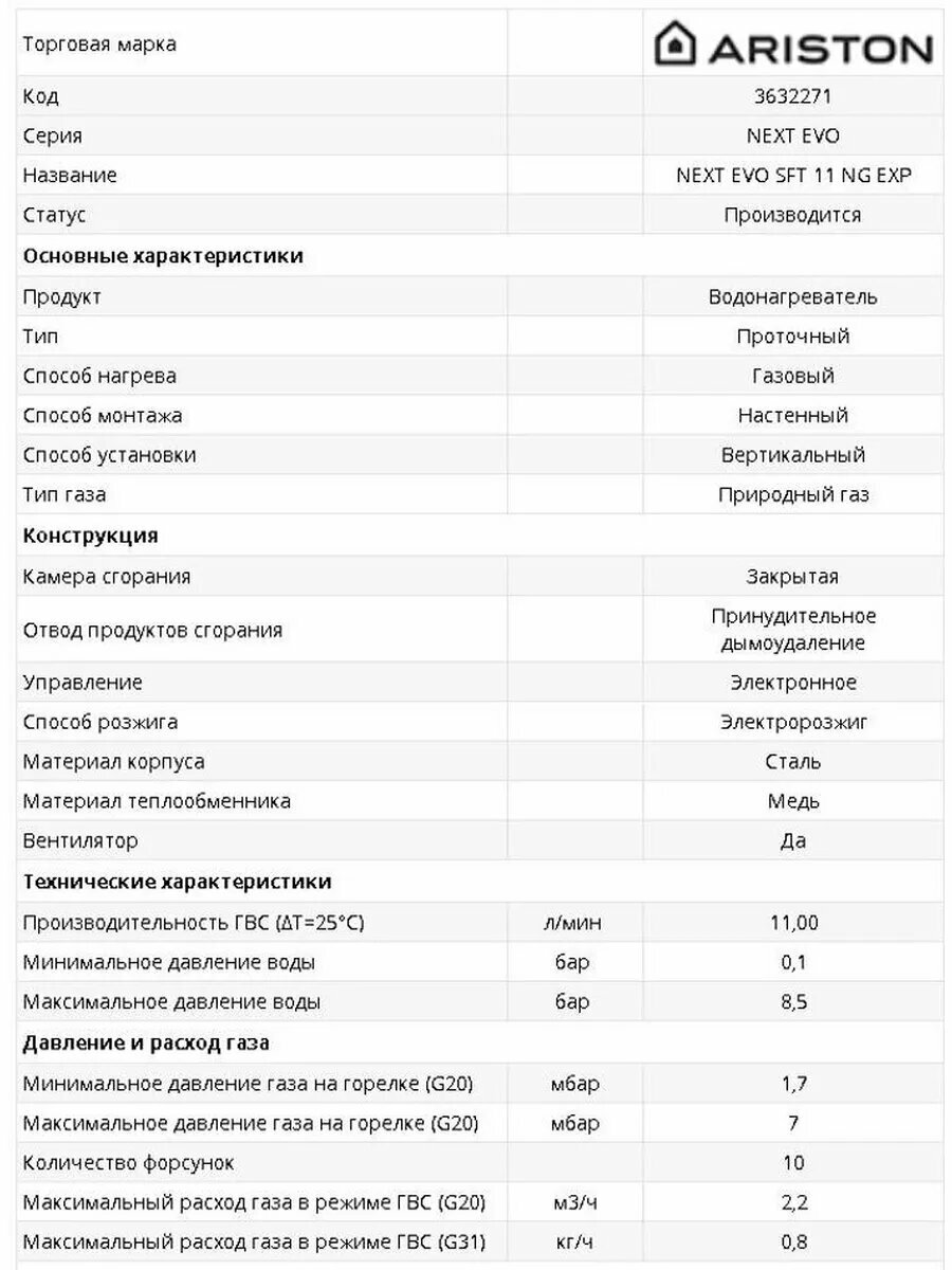 Сервис сравнения цен СкидкаГИД предлагает сравнить цены на товар «Газовая колонка ARISTON NEXT EVO SFT 11 NG EXP 19580Вт 11л/мин 550х330х167мм»