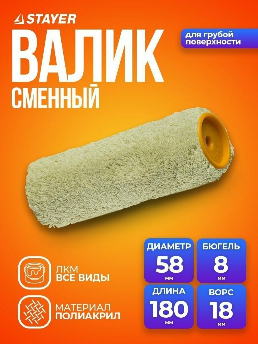 Ролик STAYER Profi SYNTEX ПОЛИАКРИЛ 0222-18 фасадный ворс 18мм бюгель 8мм 58х180мм