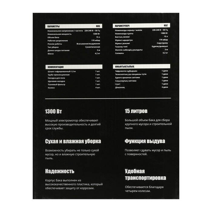Строительный пылесос Kolner KVC 1300 сухая/влажная 1300Вт бак 15л рабочее разряжение 170мБар