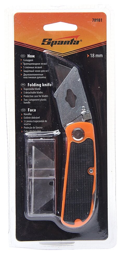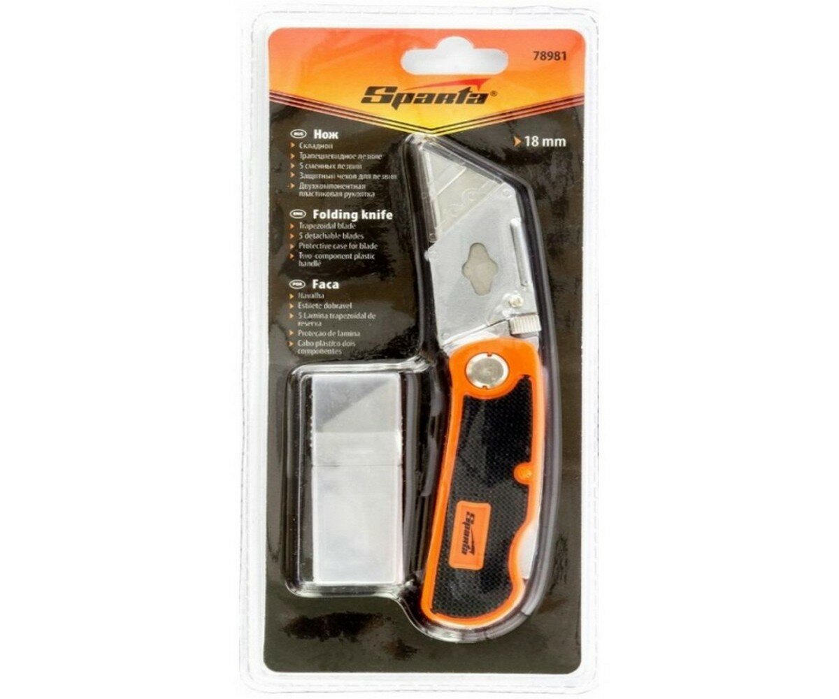 Нож 18 мм складной пластиковая двухкомп рукоятка сменное трапециевидное лезвие+5 лезв.// Sparta 78981