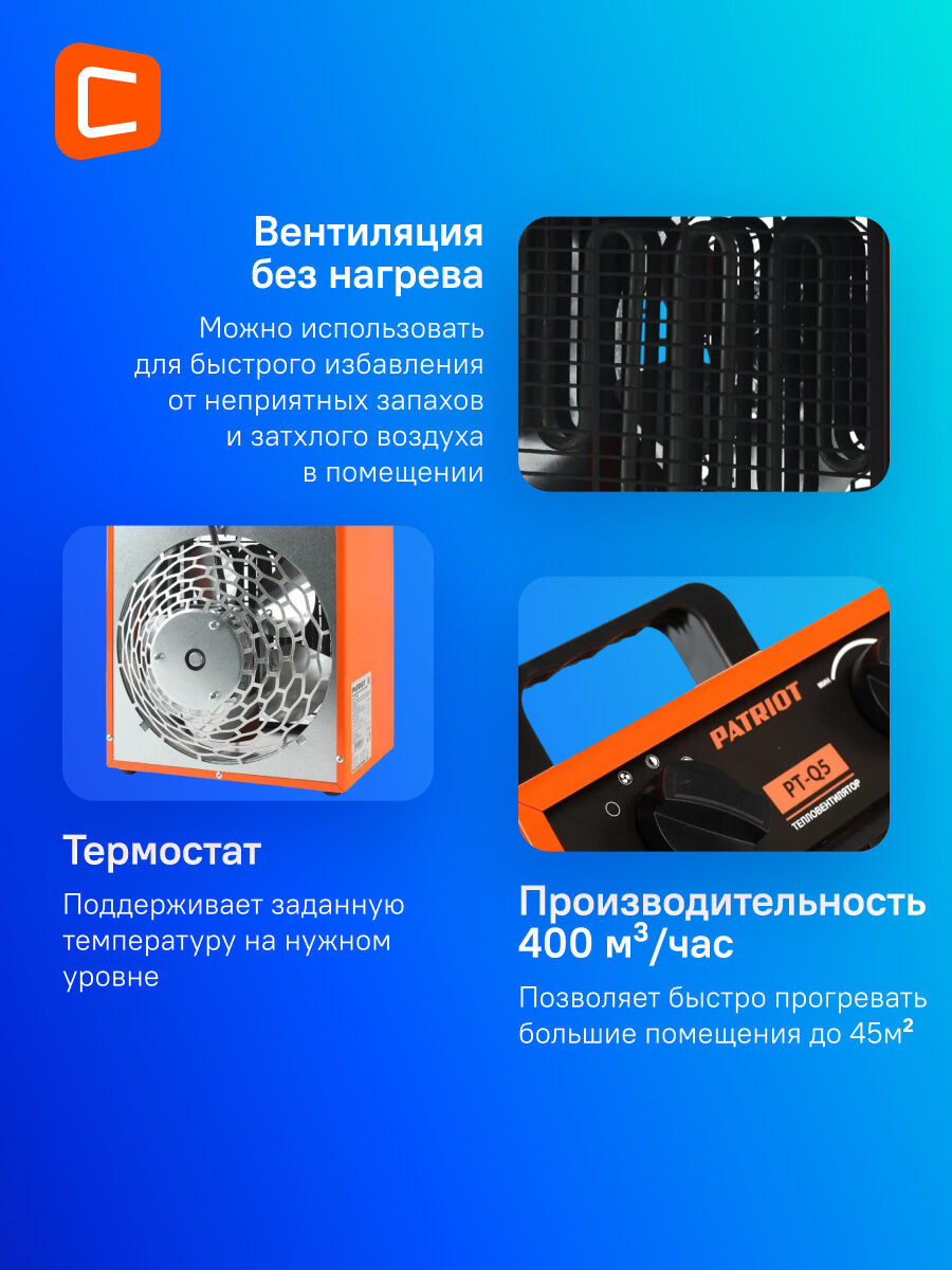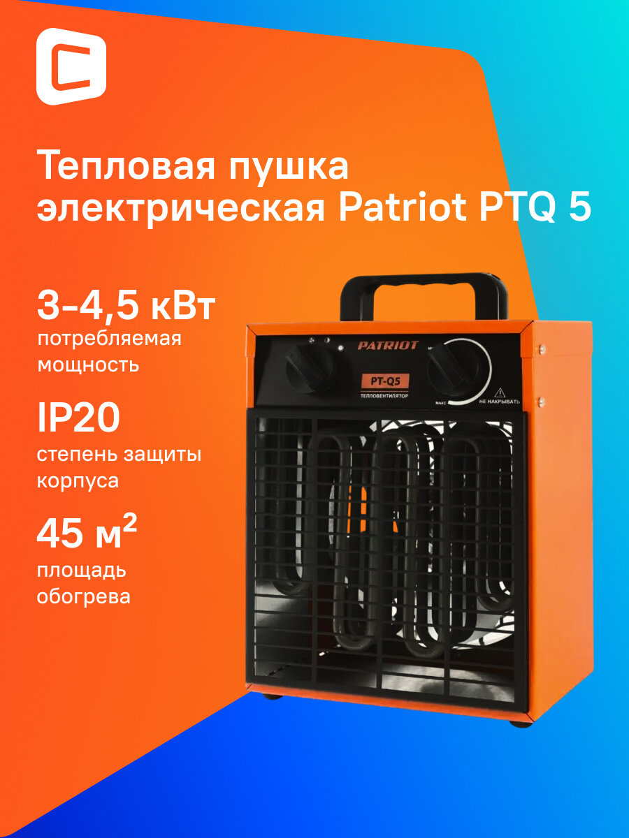 | Прочие особенности и свойства | Тепловая пушка электрическая Patriot PTR 5S оснащена воздуходувным элементом, при помощи которого нагретый воздух равномерно распределяется по помещению, что способствует его быстрому прогреву. Керамический нагревательный элемент, установленный в приборе, является одним из наиболее долговечных, что положительным образом сказывается на эксплуатационном периоде тепловой пушки. С помощью регулируемого термостата вы сможете подобрать необходимую температуру прогрева помещений. А функция защиты от перегрева, реализованная в модели Patriot PTR 5S, не позволит ей выйти из строя даже при непрерывной и напряженной работе. |