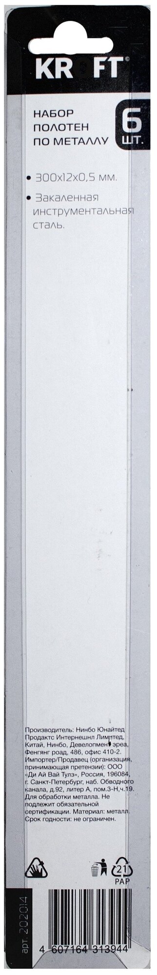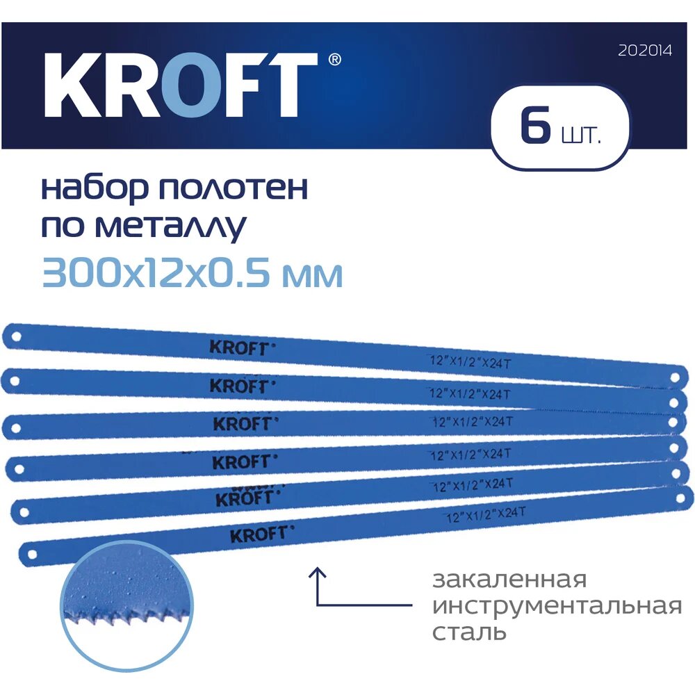 | Прочие характеристики и свойства | Набор полотен по металлу KROFT 202014 6шт для ручной ножовки |