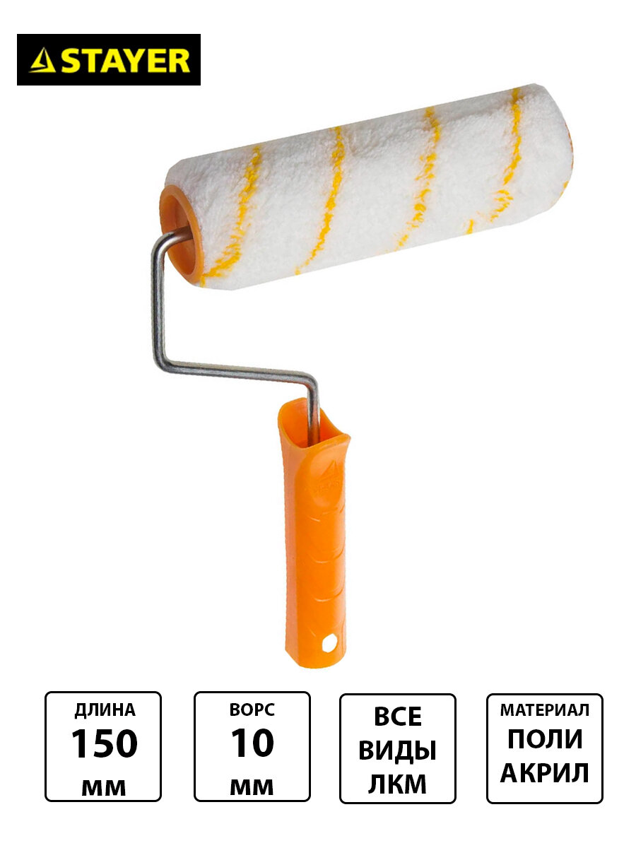 Валик малярный Stayer из полиакрила в сборе — это высококачественный инструмент, который станет незаменимым помощником в покрасочных работах.Преимущества: Высокое качество материала — полиакрил, из которого изготовлен валик, обеспечивает долговечность и надёжность инструмента. Благодаря этому валик прослужит долгое время без потери своих свойств. Оптимальная длина и диаметр — 150 мм и 30 мм соответственно, что позволяет удобно работать с большими поверхностями, обеспечивая равномерное нанесение краски. Ворс 10 мм — обеспечивает хорошее впитывание и отдачу краски, а также лёгкую очистку. Универсальность — подходит для всех видов лакокрасочных материалов и поверхностей со средней шероховатостью.