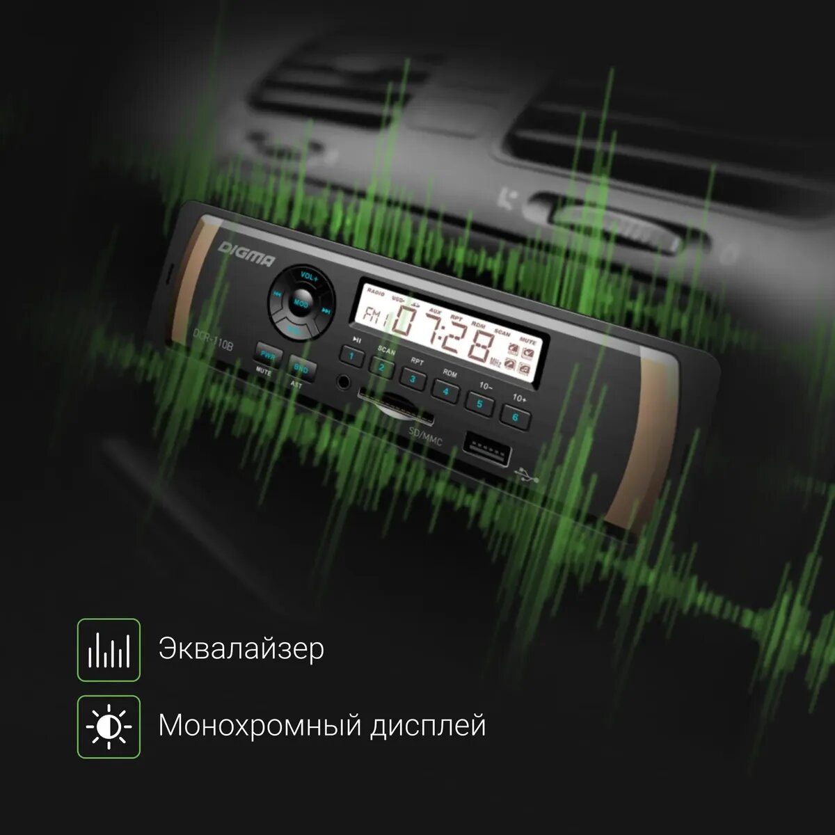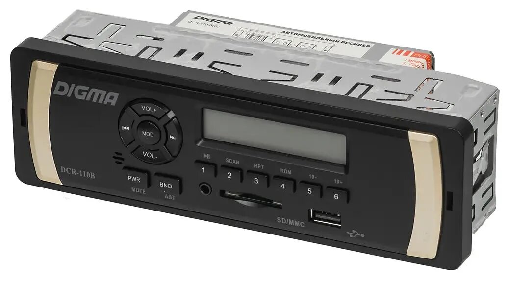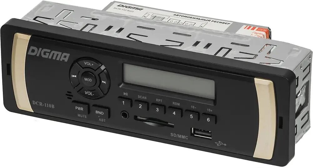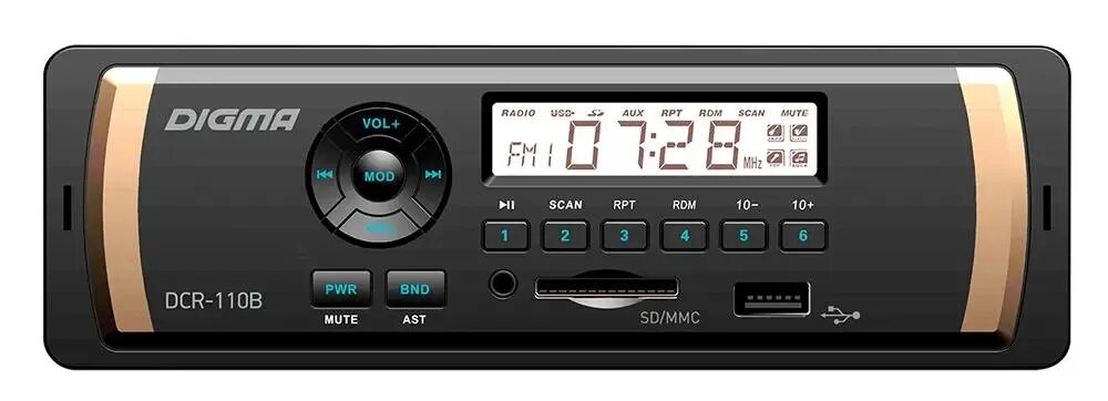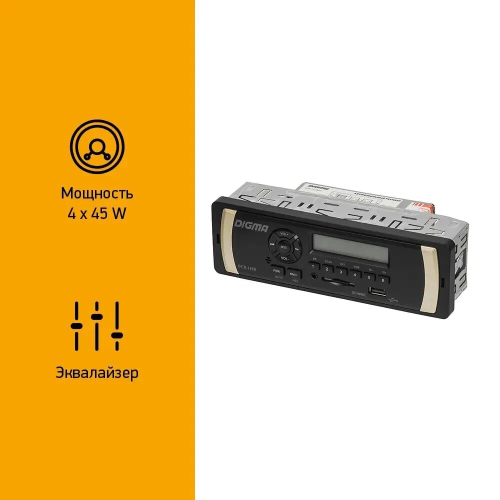 Автомобильная магнитола Digma DCR-110B – компактная функциональная модель с универсальными параметрами, позволяющими установку в приборную панель любого автомобиля.