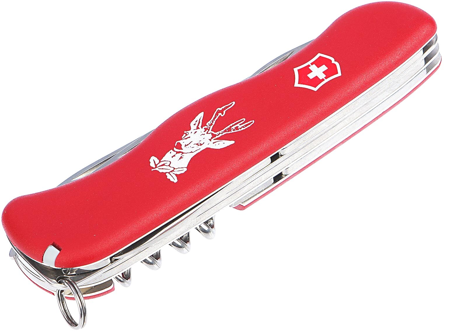 | Список инструментов | шило, штопор, пинцет+щипчики, открывалка для бутылок, отвертка, консервный нож, большое лезвие, пила по дереву, зубочистка, инструмент для снятия изоляции, кольцо для ключей |