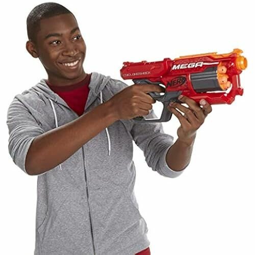 Мощный представитель семейства игрового оружия Нерф серии Mега - бластер револьверного типа «Циклон Шок». Яркий запоминающийся дизайн – красный корпус с черными элементами и широкое дуло, для патронов большого калибра. Тяжелый барабан, находящийся впереди, вмещает 6 патронов калибра Мега.