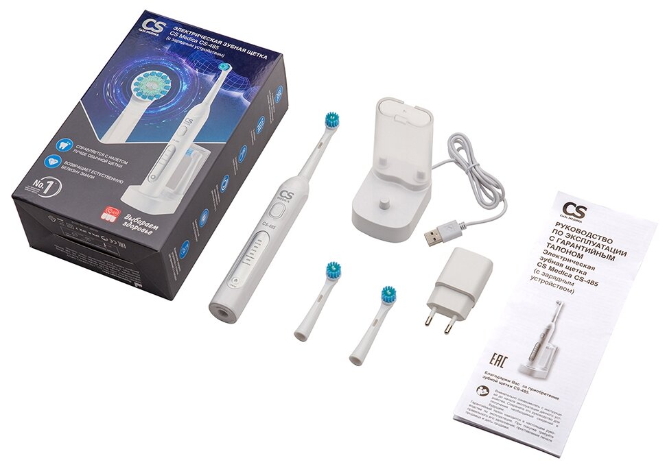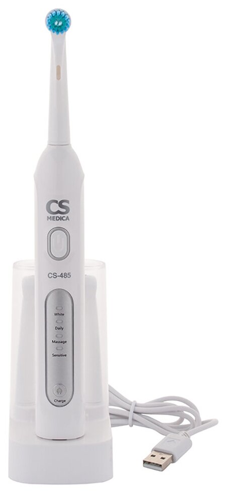 Электрическая зубная щетка CS Medica снабжена 4 режимами чистки, промежуточным таймером и функцией автоматического отключения, с помощью чего достигается эффект максимального очищения. Совершая около 8 000 движений/мин зубная щетка бережно удаляет налет, не травмируя зубную эмаль. Есть возможность бесконтактной подзарядки. Одного полного заряда батареи хватает на 14 дней регулярного использования. Одобрена для использования Стоматологической ассоциацией России.