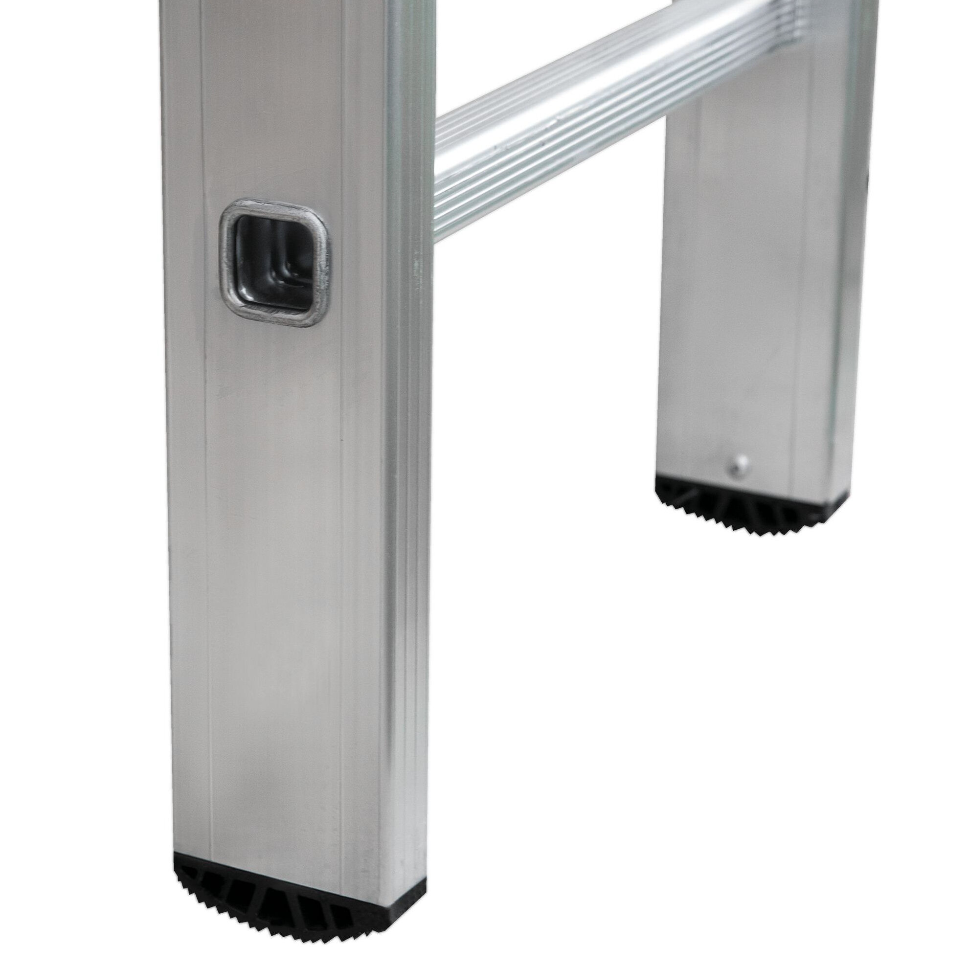 - Опорные пластиковые наконечники с обеих сторон не повреждают рабочую поверхность, повышают устойчивость лестницы, безопасность пользователя.