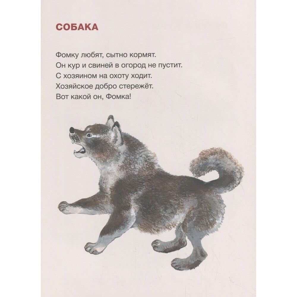 Красивые и реалистичные рисунки Евгения Ивановича с короткими и мелодичными описаниями животных отлично подойдут для первого знакомства ребенка с домашним животными и их ближайшими соседями.