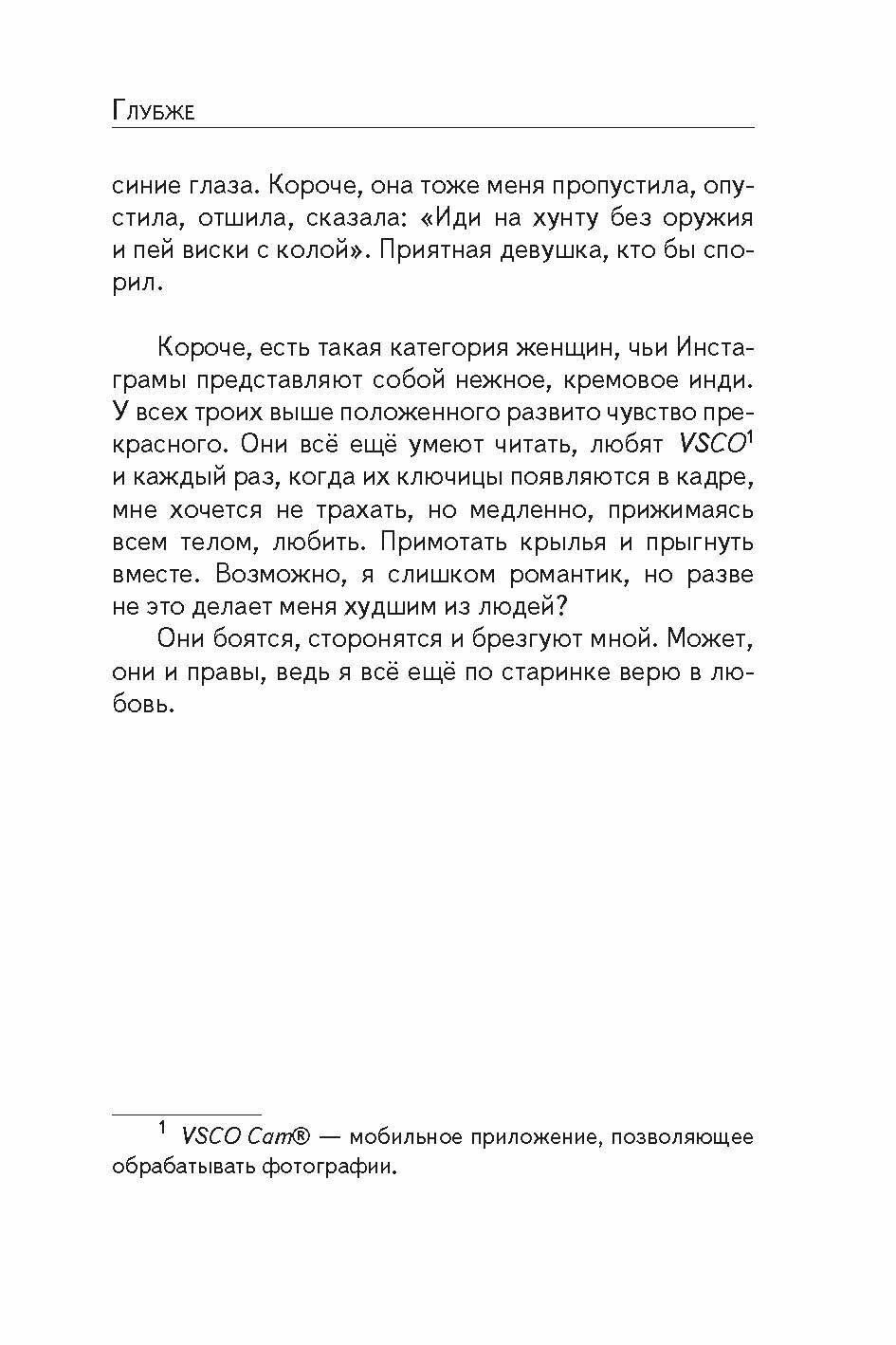 "Глубже" - книга наблюдений за современным окружающим миром, его обитателями, героями, моралью - сквозь призму едкого, саркастичного, порой жесткого, но неизменно точного взгляда Васи Аккермана.