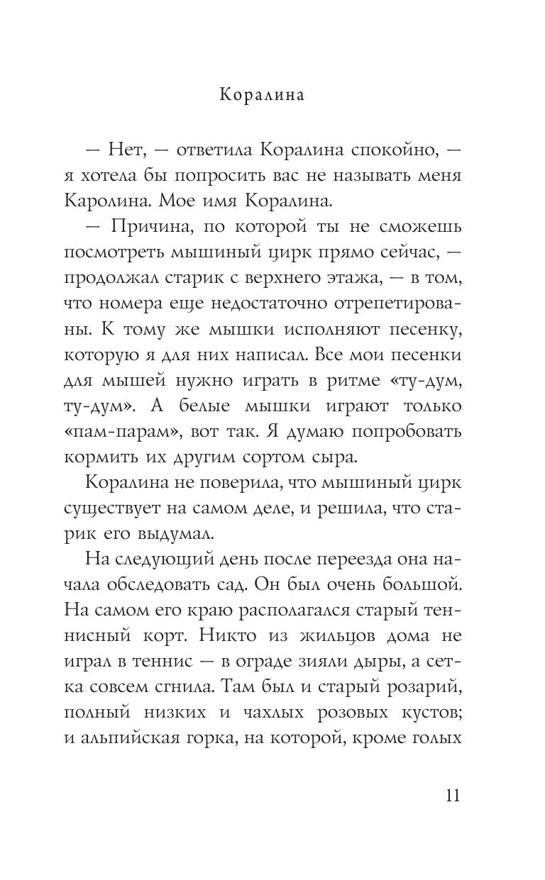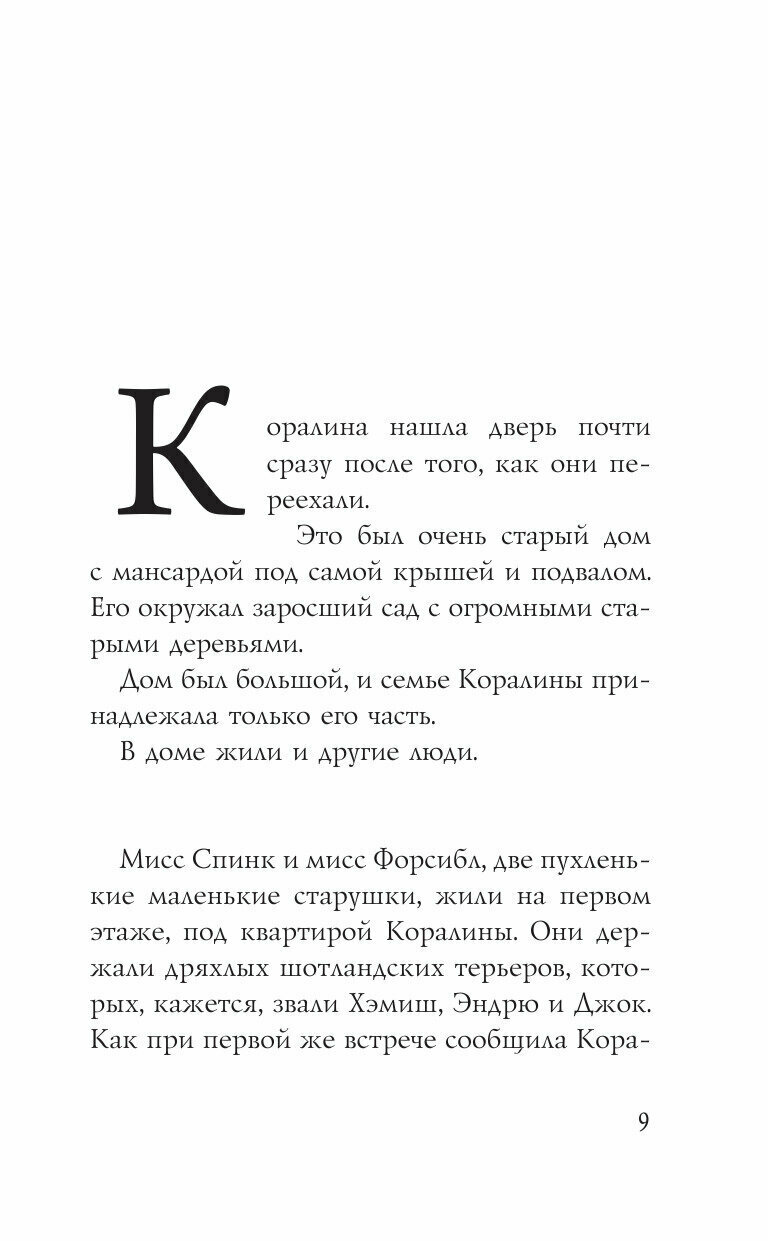 Что делать, если ты переехала в новый дом, до школы еще целая неделя, на улице дождь и туман, а родители вечно заняты? Разумеется, исследовать! Так юная Коралина знакомится с весьма странными соседями и в высшей степени независимым черным котом, а потом обнаруживает запертую дверь, ведущую в… никуда? Как бы не так! За этой дверью - целый мир! Мир, в котором все точно так же - и совершенно по-другому. Мир, в котором тебя ждут вкусная еда и красивая одежда, но главное - другие мама и папа: точно такие же, но более внимательные и заботливые. Только кожа их тонка и бела, как бумага. Только пальцы их чересчур длинные и нервные, а вместо глаз у них - круглые пуговицы. Только слишком уж жутко от одной мысли остаться с ними навсегда…