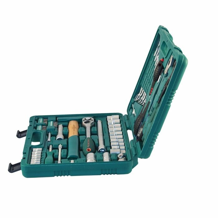 | Содержание набора | Удлинитель, Трещотка, Свечные головки, Вороток, Отвертки, Молоток, Ключ гаечный комбинированный, Торцевые головки, Биты, Пассатижи, Адаптер, Переходник, Карданный шарнир, Держатель |