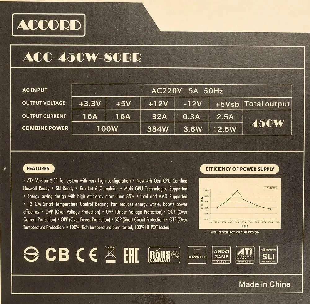 Блок питания Accord ATX 450W ACC-450W-80BR. PFC-нет. Защита от перенапряжения. Защита от короткого замыкания. Защита от перегрузки.