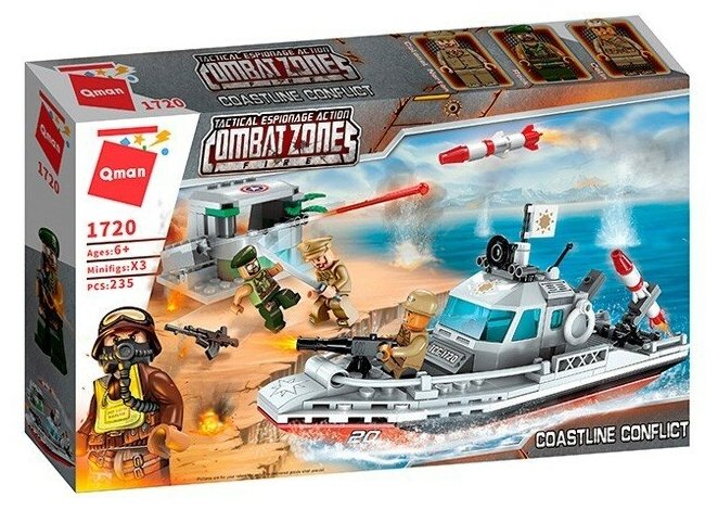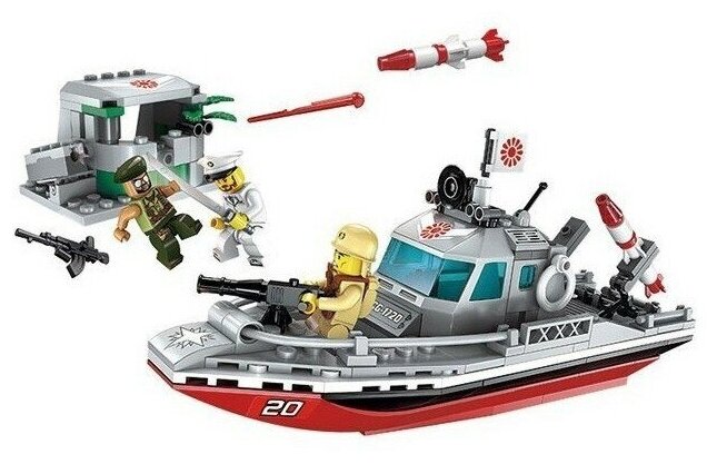 Из комплекта собирается ракетный катер, береговые укрепления, и вооруженные фигурки двух моряков, и зеленого берета.