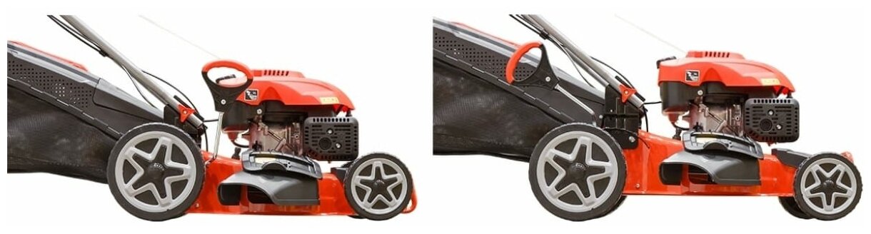 - Удобство хранения газонокосилки достигается складной ручкой и мягким травосборником.
