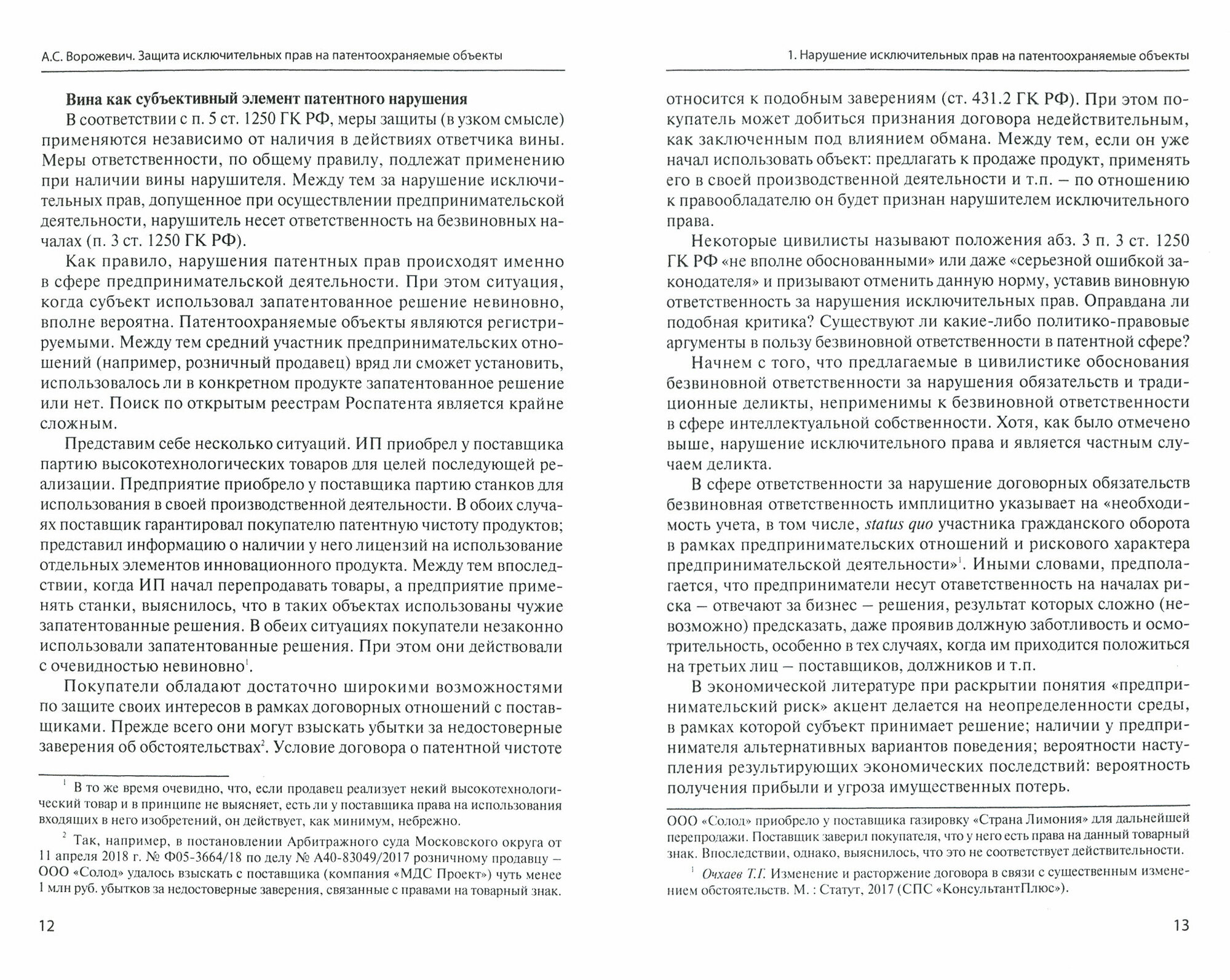 В монографии представлена разработанная автором теоретическая конструкция механизма защиты нарушенных исключительных прав на патенто-охраняемые объекты. Автор раскрывает состав патентных нарушений, уделяя особое внимание сущности и пределам применения доктрины эквивалентов, критерию вины как субъективному условию ответственности. Рассматривает теоретические и практические проблемы, связанные с взысканием с нарушителей убытков или компенсации, предлагая существенно изменить сложившиеся подходы к их расчету. Исследует сущность и виды злоупотреблений патентными правами, правовые инструменты их пресечения.