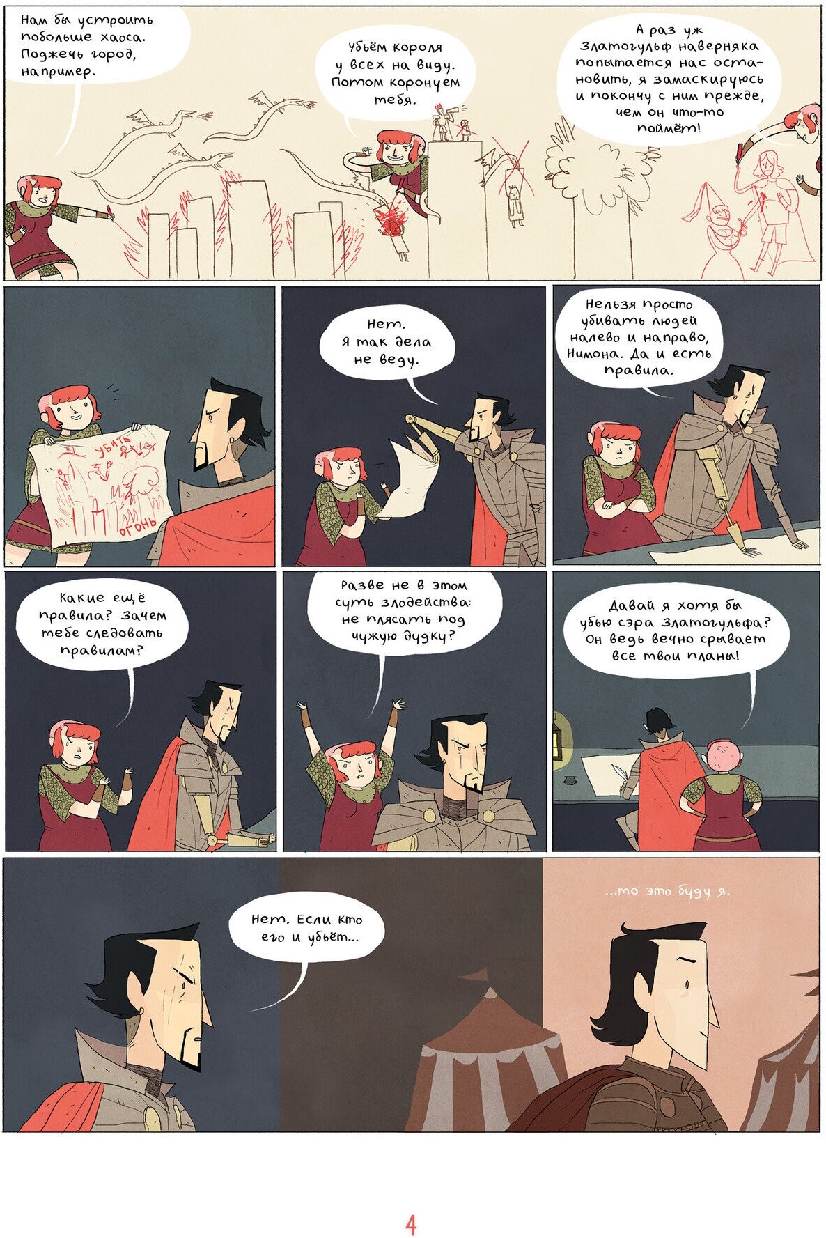К знаменитому злодею Баллистеру Черносерду вдруг заваливается неизвестная девушка и напрашивается ему в приспешники. Девушку зовут Нимона, и она - перевертыш, способный превращаться в любого человека или живое существо. Она ничего не рассказывает о прошлом, но горит желанием помочь Баллистеру в его борьбе с двуличной Академией и её чемпионом сэром Златогульфом.