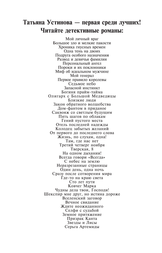 Татьяна Устинова — один из топовых авторов современной российской прозы, обладатель двух премий «Электронная буква», лауреат «ТЭФИ» в номинации «Сценарист телевизионного фильма». «Первая среди лучших» — так называют Татьяну Витальевну, и это не просто остроумный эпитет, а звание, подтвержденное десятками написанных романов, успешными экранизациями и, конечно, любовью многочисленных поклонников ее творчества.