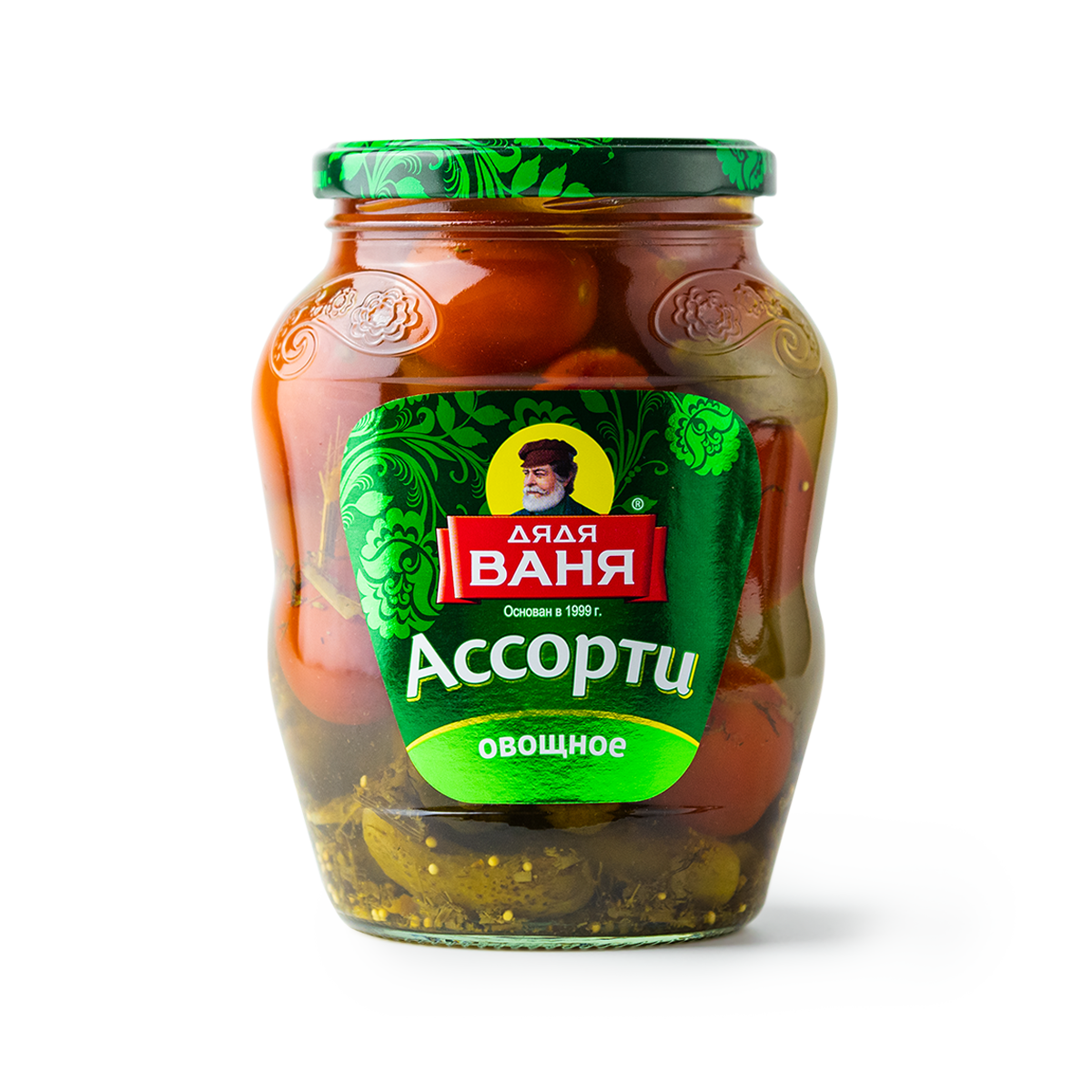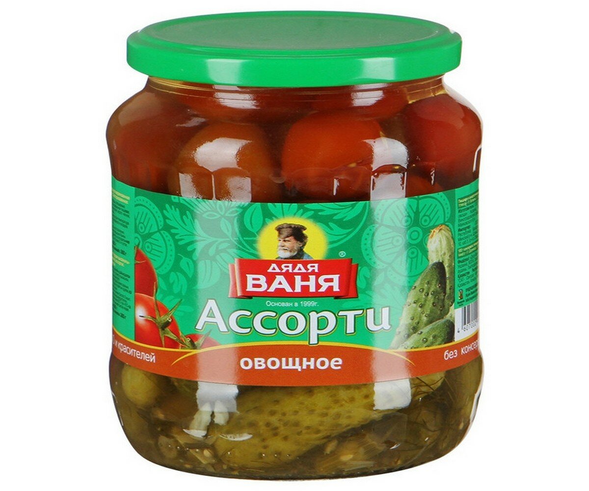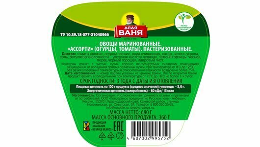 Описание товара:Овощное ассорти Дядя Ваня (огурцы, томаты) 680 г. ГОСТ Р 52477-2005.Состав товара:Томаты свежие, огурцы свежие, очищенная вода, сахар, зелень укропа, соль, регулятор кислотности - уксусная кислота, специи, пряности (в том числе семена горчицы).Меры предосторожности:Хранить при относительной влажности воздуха не более 75%. После вскрытия банки продукт хранить в холодильнике от +2°C до +6°C не более 3-х суток.