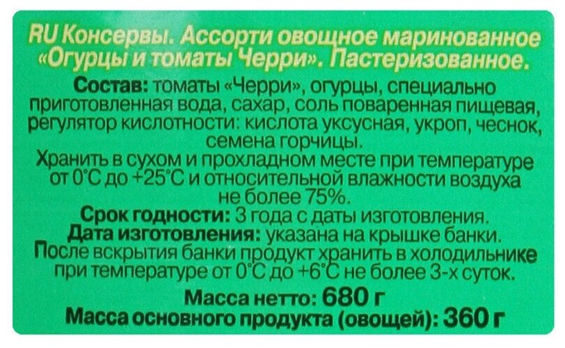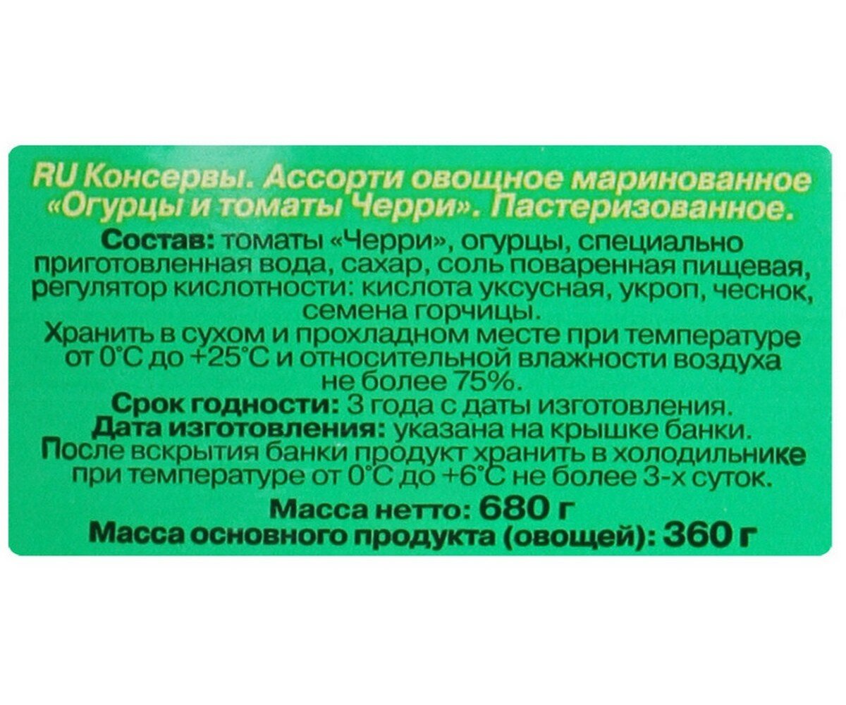 | Состав | томаты свежие, огурцы свежие, очищенная вода, сахар, зелень укропа, соль, регулятор кислотности - уксусная кислота, специи, пряности (в т.ч. семена горчицы) |