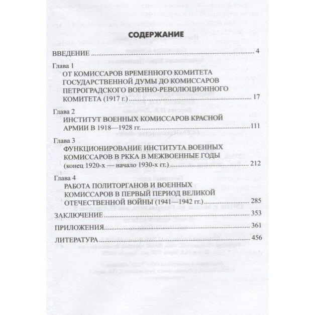 Автор подразделяет историю военных комиссаров на несколько периодов: дореволюционный, Гражданская война, межвоенные годы, Великая Отечественная война - каждому из них посвящена отдельная глава. Из-за большого объема информации работа носит скорее обзорный характер. В приложении представлены нормативные документы, регламентировавшие деятельность этой организации, а также довольно большой биографический справочник. Добротное издание: белая бумага, печать на уровне, ч\\б фото по теме. Хорошая работа для общего ознакомления с темой.