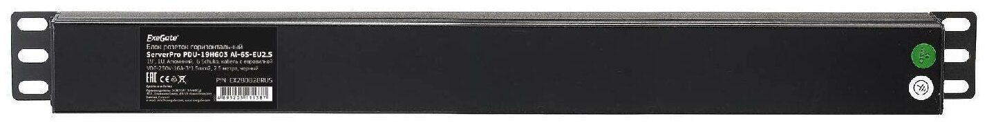 Exegate EX280828RUS Блок розеток ExeGate ServerPro PDU-19H603 Al-6S-EU2.5, 19",1U,алюм, 6Schuko, евровилка, 2.5м