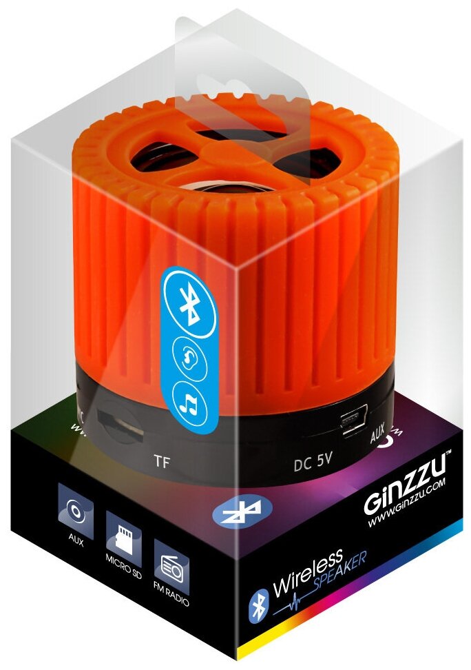 Портативная колонка GINZZU GM-988 станет хорошим выбором для прослушивания музыки. Ее можно полноценно использовать дома, взять с собой в поездку или на прогулку. Модель крайне проста и удобна в применении. Он изготовлен из пластика, защищает внутренние компоненты от повреждения. Вес модели небольшой – 120 г. Колонку можно комфортно брать с собой, она не занимает много места в сумке. Мощность модели оптимальная, составляет 3 Вт. Можно получить звук с высокой максимальной громкостью. Устройство воспроизводит частоты от 200 до 15000 Гц. Удается добиться хорошего качества звучания. Колонка поддерживает формат файлов MP3. Это один из самых распространенных вариантов на данный момент. Подключение устройства происходит без проводов, применяется Bluetooth для передачи информации. Можно поставить карту памяти для считывания файлов с нее. Поддерживаются носители формата microSD. Питается устройство от встроенной батареи. Емкость аккумулятора составляет 300 мА•ч, чего хватит для работы в течение 8 часов без подзарядки.