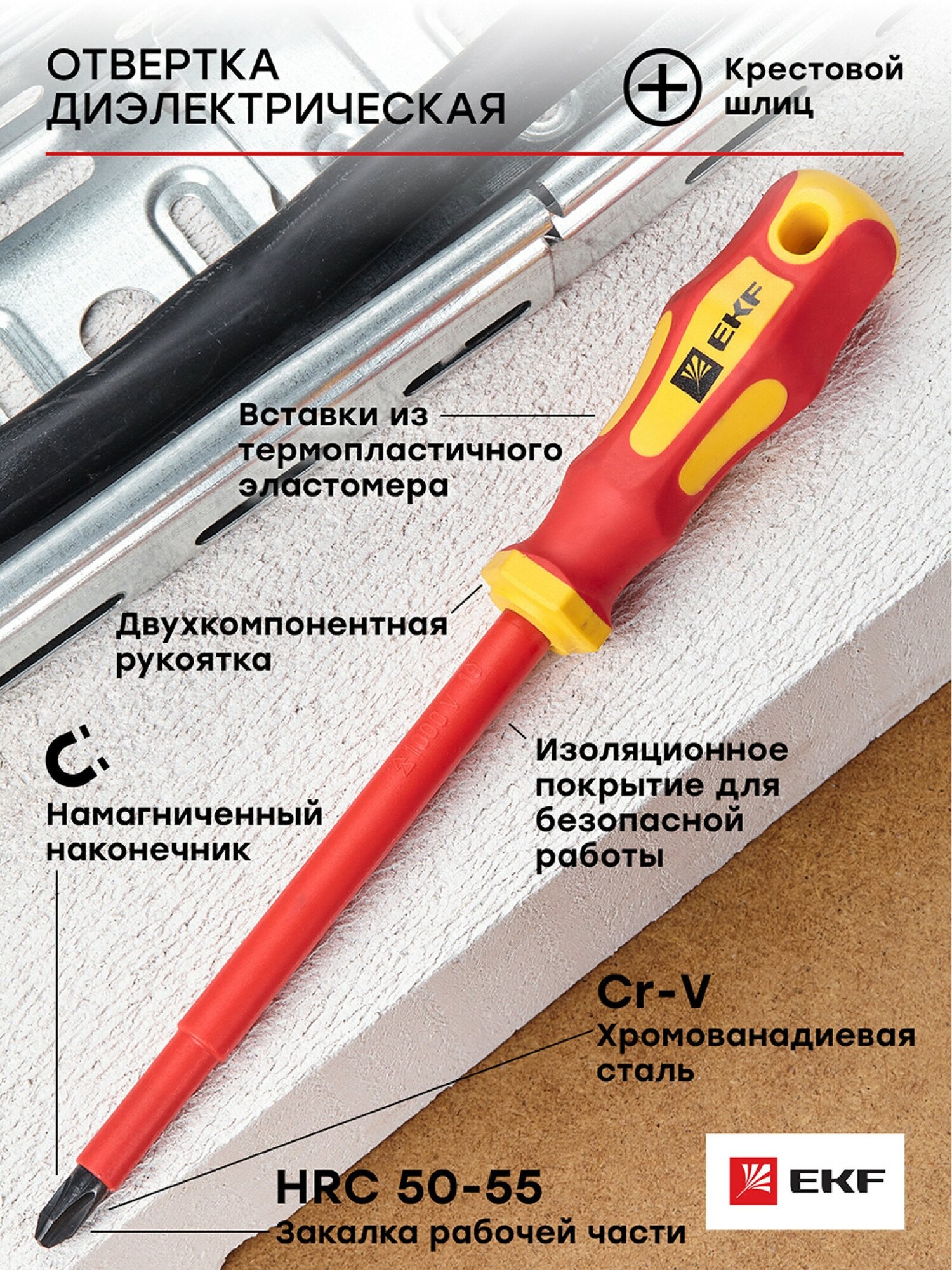 ОПИСАНИЕ. Диэлектрические отвертки – специальный профессиональный инструмент с изоляционным покрытием для безопасной работы с приборами и электросетями, находящимися под высоким напряжением (до 1000В). Отвертки серии Master и отвертки серии Expert изготовлены в строгом соответствии с требованиями EN 60900 / IEC 60900:2004 и каждая отвертка проходит индивидуальное тестирование воздействием напряжения в 10 000 В. ПРЕИМУЩЕСТВА. Рабочая часть отверток выполнена из Cr-V – хромованадиевой стали, что делает ее устойчивой к механическим повреждениям, температурным воздействиям и образованию коррозии. Намагниченный наконечник с дополнительной закалкой Master HRC 50-55 Expert HRC 52-58. Высококачественный материал двухкомпонентной рукоятки обеспечивает плотный контакт и минимизирует эффект скольжения. Специальная форма рукояток обеспечивает увеличенный крутящий момент при минимальных физических затратах. Маркировка типа и размера отвертки на рукоятке. ПРИМЕНЕНИЕ. Диэлектрическая отвертка предназначена для работы с крепежом, который используется в электротехнических устройствах, находящихся под напряжением. Благодаря специальному изоляционному покрытию, исключается риск поражения пользователя током, даже когда напряжение достигает 1000 В.