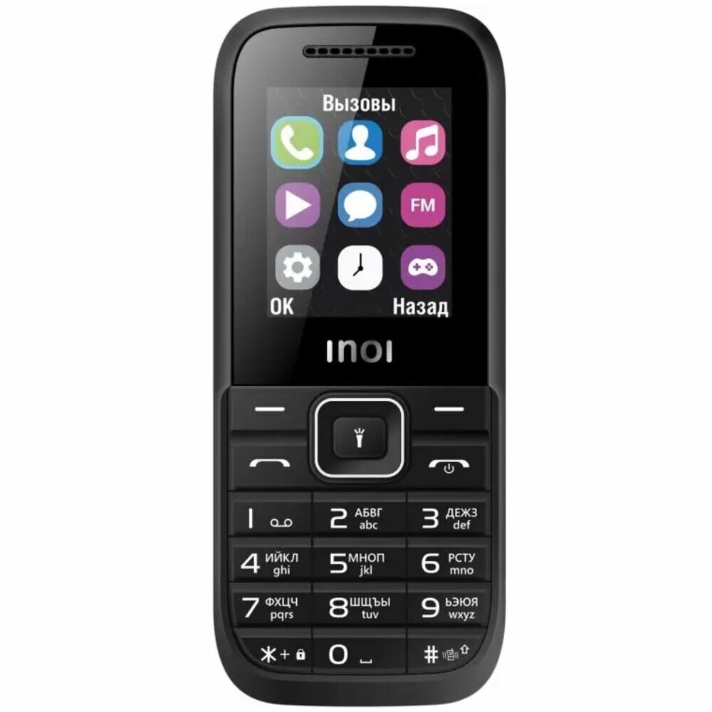 Кнопочный мобильный телефон Inoi черного цвета — это компактная модель, которую удобно брать с собой в дорогу.