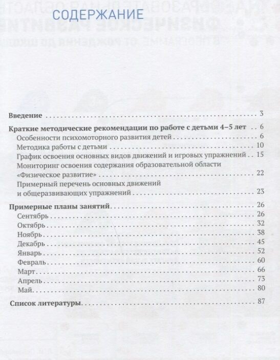 Материалы пособия: примерные планы занятий, комплексы общеразвивающих упражнений и многочисленные игровые упражнения, — помогут педагогу творчески подходить к проведению занятий по физическому развитию, учитывая потребности конкретной группы детей. График освоения детьми основных видов движений даст возможность педагогу легко планировать поэтапную работу с детьми.