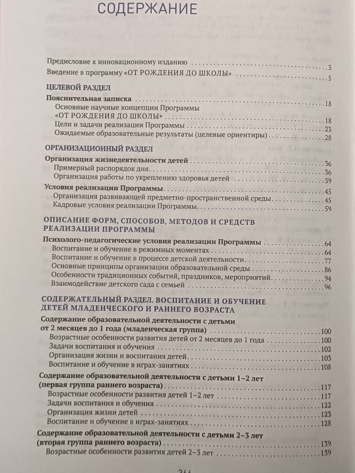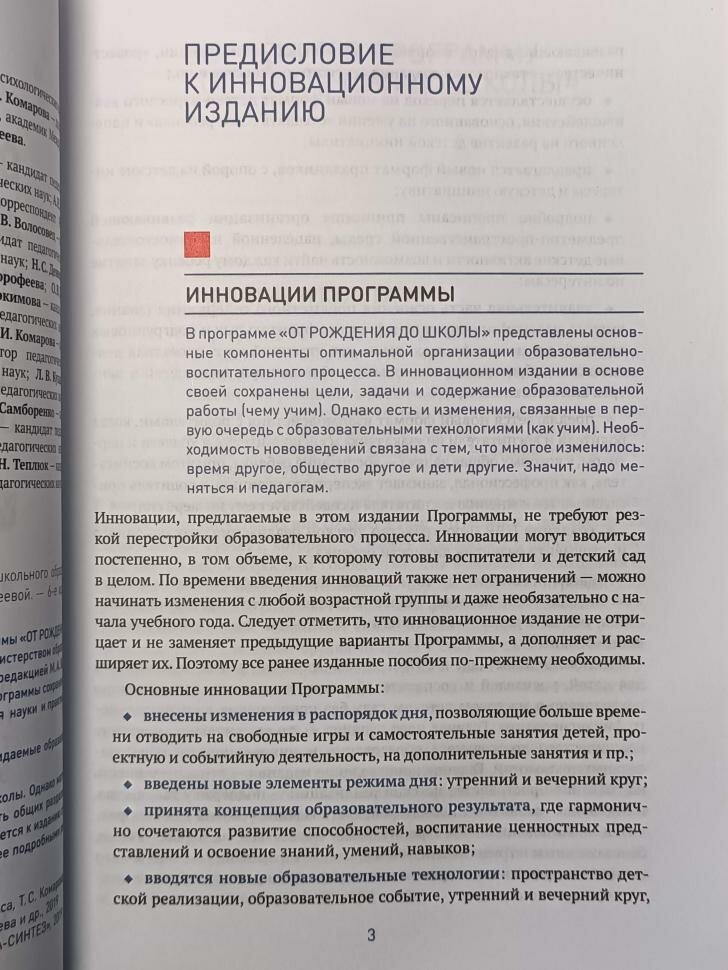 В программе "ОТ РОЖДЕНИЯ ДО ШКОЛЫ" представлены основные компоненты оптимальной организации образовательно-воспитательного процесса. В основе пятого, инновационного, переиздания лежит выпущенная в 2004 году, рекомендованная Министерством образования РФ программа "Воспитание и обучение в детском саду" под редакцией М.А. Васильевой, В.В. Гербовой, Т.С. Комаровой. В пятом издании Программы сохранены все достоинства первого издания и учтены новейшие достижения науки и практики отечественного и зарубежного дошкольного образования. Важно, что предлагаемые инновации не требуют резкой перестройки. Они могут вводиться постепенно, в том объеме, к которому готовы воспитатели и детский сад в целом. По времени введения инноваций также нет ограничений — можно начинать изменения с любой возрастной группы и даже не обязательно с начала учебного года. Инновационное издание не отрицает и не заменяет предыдущие варианты Программы, а дополняет и расширяет их. Программа "ОТ РОЖДЕНИЯ ДО ШКОЛЫ" обеспечена учебно-методическим комплектом (УМК), который постоянно обновляется и дополняется. При этом все ранее изданное к Программе безусловно сохраняет свою актуальность.
