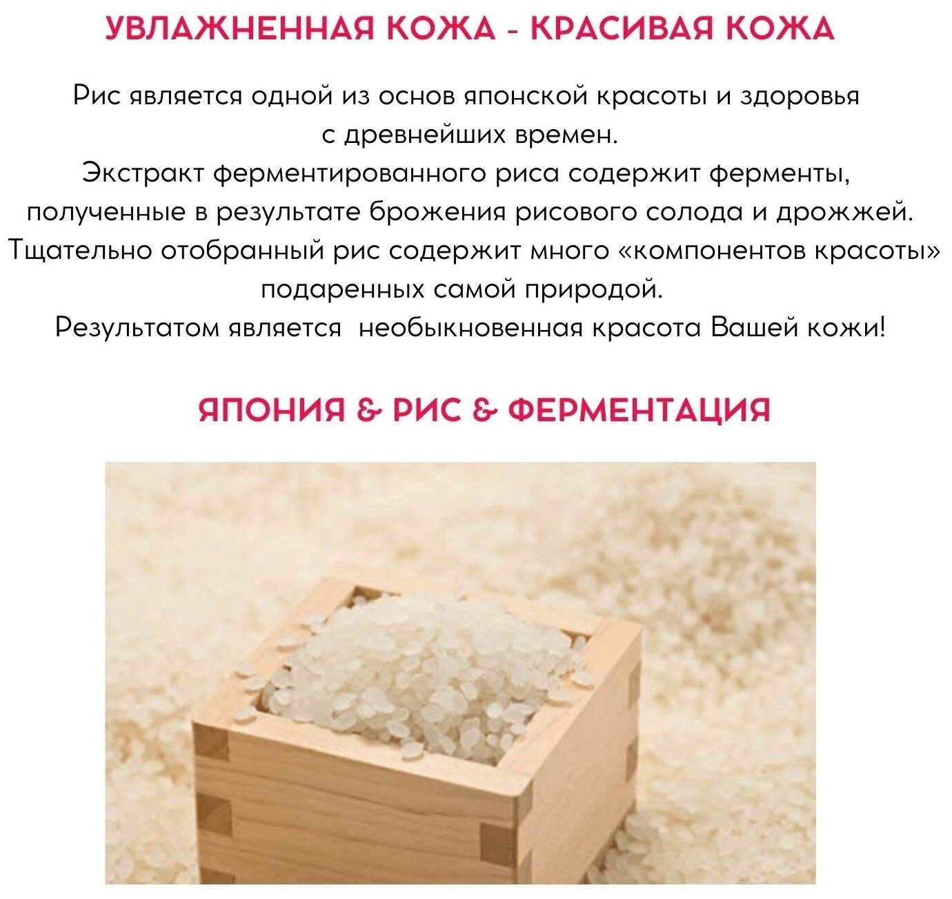 Косметическая сыворотка, в состав которой входит 5 компонентов, полученных из риса, глубоко увлажняет кожу, делая ее гладкой и бархатистой. Активные компоненты: Экстракт ферментированного риса богат минералами, аминокислотами и органическими кислотами (молочная, яблочная, лимонная и т. д.), а также имеет низкомолекулярный состав, что позволяет питательным веществам глубже проникать в кожу. Придает коже гладкость и упругость. Рисовый экстракт, получаемый из отборного белого риса, придает коже упругость, эластичность и насыщает ее влагой. Церамиды риса растительного происхождения, получаемые из рисовых отрубей и пророщенного риса, защищают кожу и удерживают в ней влагу. Экстракт рисовых отрубей, получаемый из рисовых отрубей и пророщенного риса, восстанавливает кожу, делая ее увлажненной и светящейся изнутри. Масло рисовых отрубей питает кожу, придает ей гладкость и упругость.