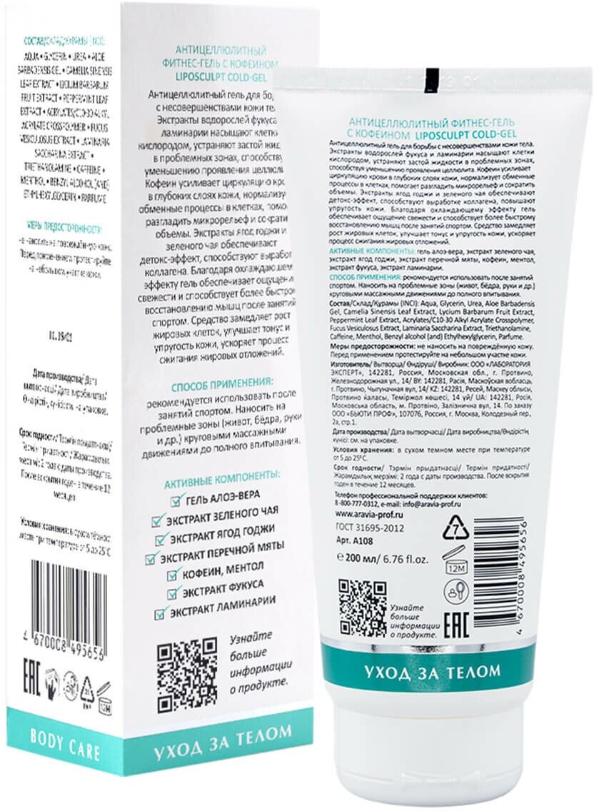 | Полное наименование | Фитнес-гель антицеллюлитный ARAVIA Laboratories Liposculpt Cold Gel (A108). 200 мл. |