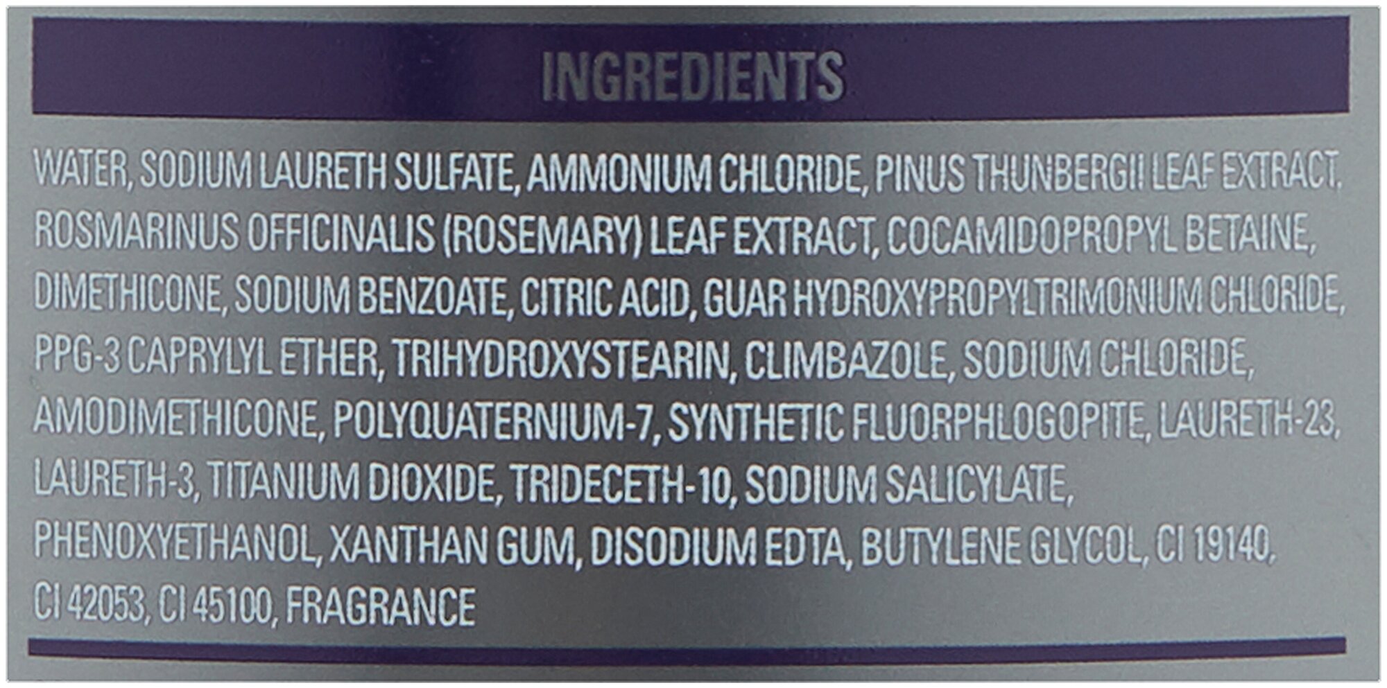 Состав: вода, отдушка, лимонная кислота, натрия хлорид, бутилен гликоль, розмарина листьев экстракт, феноксиэтанол, кокамидопропил бетаин, натрия бензоат, камедь ксантовая, аммония хлорид, диметикон, поликватерниум-7, динатрий эдта, гуар гидроксипропилтримониум хлорид, натуральные растительные экстракты, натрия лаурет сульфат, лаурет-3, тридецет-10, амодиметикон, натрия салицилат, лаурет-23, диоксид титана, сосны листьев экстракт, ппг-3 каприловый эфир
