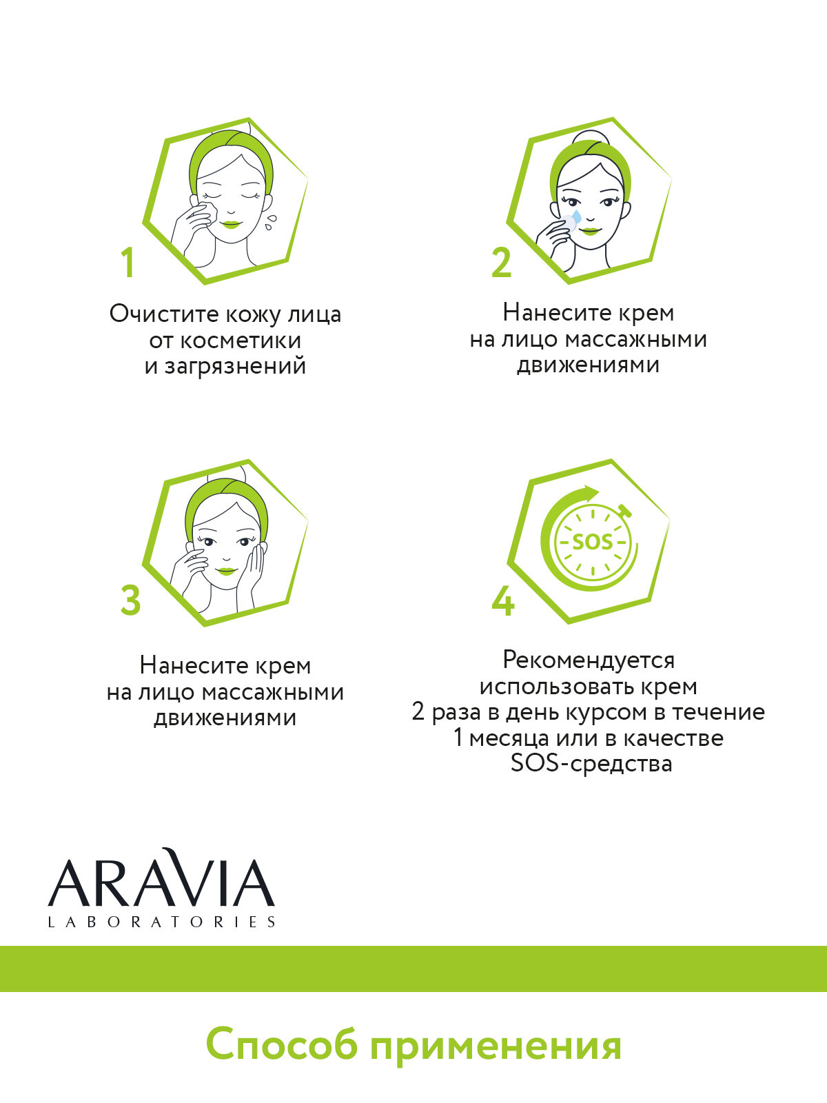 Нанесите крем на предварительно очищенную кожу. Рекомендуется использовать 2 раза в день курсом в течение 1 месяца или в качестве SOS-средства.