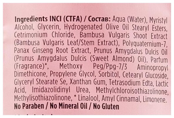 | Состав | aqua (water); myristyl alcohol; glycerin; hydrogenated olive oil stearyl esters; cetrimonium chloride; bambusa vulgaris shoot extract (bambusa vulgaris leaf/stem extract); polyquaternium-7; panax ginseng root extract; prunus amygdalus dulcis oil (prunus amygdalus dulcis oil (sweet almond) oil); parfum (fragrance); methoxy PEG/PPG-7/3 aminopropyl dimethicone; propylene glycol; sorbitol; cetearyl glucoside; glyceryl stearate SE; xantan gum; tetrasodium EDTA; lactic acid; imidasolidinyl urea; methylchloroisothiazolinone; methylisothiazolinone |