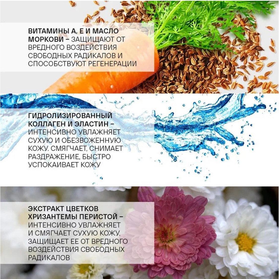 | Активные компоненты | азулен, витамины А и Е, гиалуроновая кислота, гидролизированный коллаген, гидролизированный эластин, глицерин, глюкоза, масло семян моркови, масло цветков календулы, мочевина, сахароза, сквалан, фруктоза, экстракт цветков хризантемы перистой |