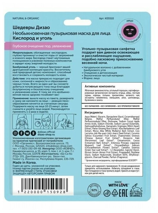 Микропузырьки, обогащенные кислородом, глубоко проникнут и очистят поры от загрязнений и кожного жира. Кислород станет неутомимым помощником в усвоении полезных компонентов и зарядит кожу энергией молодости. Бамбуковый уголь – черный бриллиант вашей драгоценной коллекции красоты. Восхитительный природный детокс- компонент, способный восстановить и сохранить молодость кожи. Действие: эта маска прекрасно подходит для кожи, склонной к жирности и образованию черных точек. Всего за один шаг вы сможете добиться потрясающего тона лица благодаря безупречному и безопасному очищению и увлажнению кожи. К тому же эта необыкновенная маска здорово позабавит вас! Глубокое очищение пор, увлажнение.