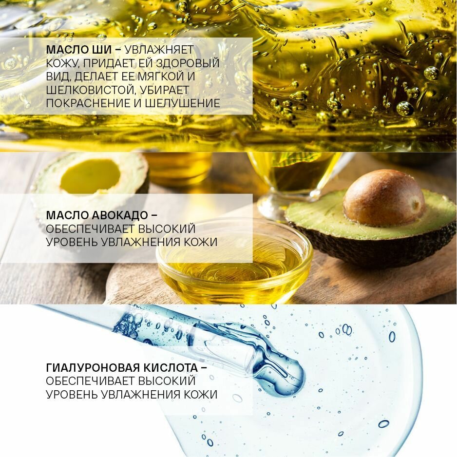 | Ингредиенты | Масла, Масло ши, Гиалуроновая кислота, Авокадо, Глицерин |