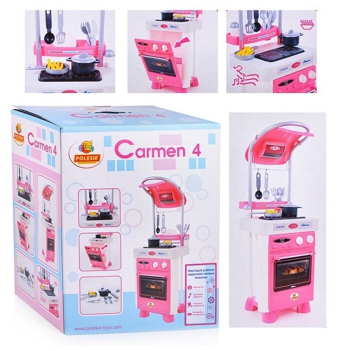 Набор «Carmen» №4 для детей - это отличный набор для воображаемого приготовления еды и развития ребенка. Играя с этим набором дети учатся самостоятельности и аккуратности. Приготавливая еду ребенок фантазирует и развивает свое мышление. Сделайте подарок для Вашего ребенка и купите ему этот замечательный набор в нашем магазине. Набор «Carmen» №4 для детей (Полесье) обладает следующими преимуществами: Данный комплект является сюжетно-ролевой игрой в кухню.Этот набор позволяет детям погрузиться в мир готовки. У этой игрушки есть как звуковые, так и визуальные эффекты. В наборе есть варочная панель и духовой шкаф. Варочная панель имеет две конфорки, на которые можно положить посуду.Также варочная панель имеет четыре кнопки, с помощью которых происходит освещение и звуковая имитация вытяжки. Ярко-розовый цвет смотрится красиво и интересно, что привлекает детское внимание. Все детали детализированы и создавались из высококачественного пластика.