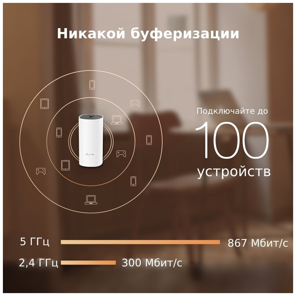 | Дополнительная информация | Многофункциональный Deco Е4 может работать в качестве роутера, точки доступа или усилителя Wi-Fi сигнала одновременно. Просто выберите подходящий режим и ощутите максимальную гибкость при использовании сети! "Для бесперебойного доступа к Wi-Fi во всём доме Deco использует систему модулей — избавьтесь от ""мертвых зон"" раз и навсегда! Комплект Deco E4 с двумя устройствами обеспечивает покрытие до 260 кв.м. Если этого недостаточно – просто добавьте в сеть больше модулей Deco для увеличения покрытия." «Deco Е4 обеспечивает быстрое и стабильное соединение со скоростью до 1167 Мбит/с и работает с основными интернет-провадерами и модемами. Deco способен поддерживать работу даже самой загруженной сети, обеспечивая одновременное соединение для более чем 100 устройств.» |