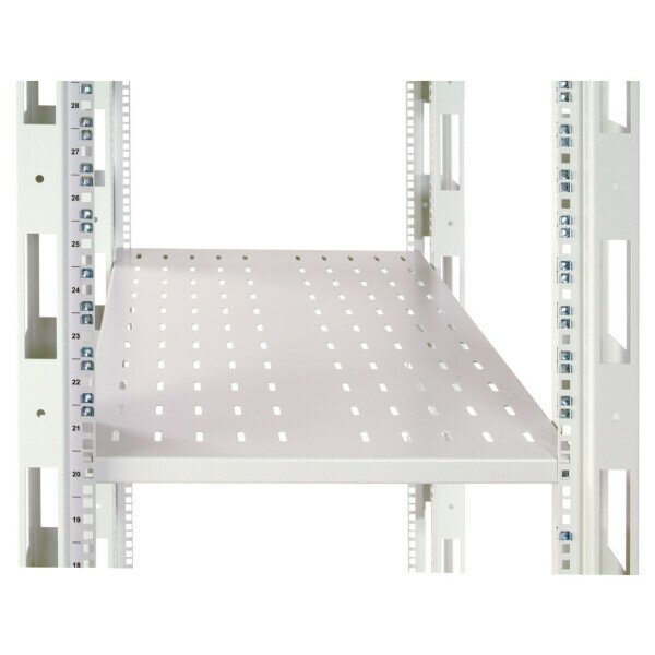 | Прочие особенности и свойства | Имеют четыре точки фиксации к вертикальным направляющим шкафов и открытых стоек. Для свободного прохождения охлаждающего воздуха полки имеют развитую перфорацию. |