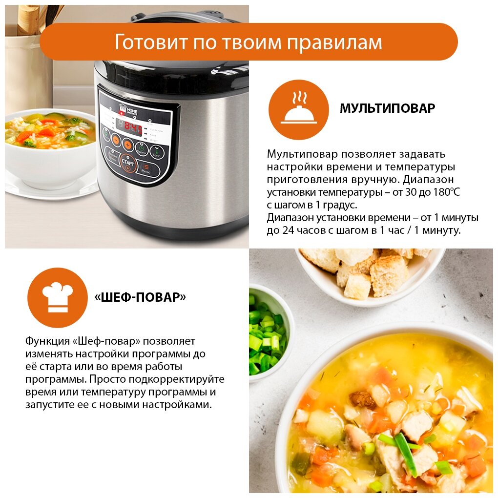 Мультиварка Home Element HE-MC661 — универсальная кухонная техника, способная заменить сразу несколько устройств. Модель оснащена 11 программами, включая «суп», «крупа», «каша», «томление», «варка», «жарка» и другие.
